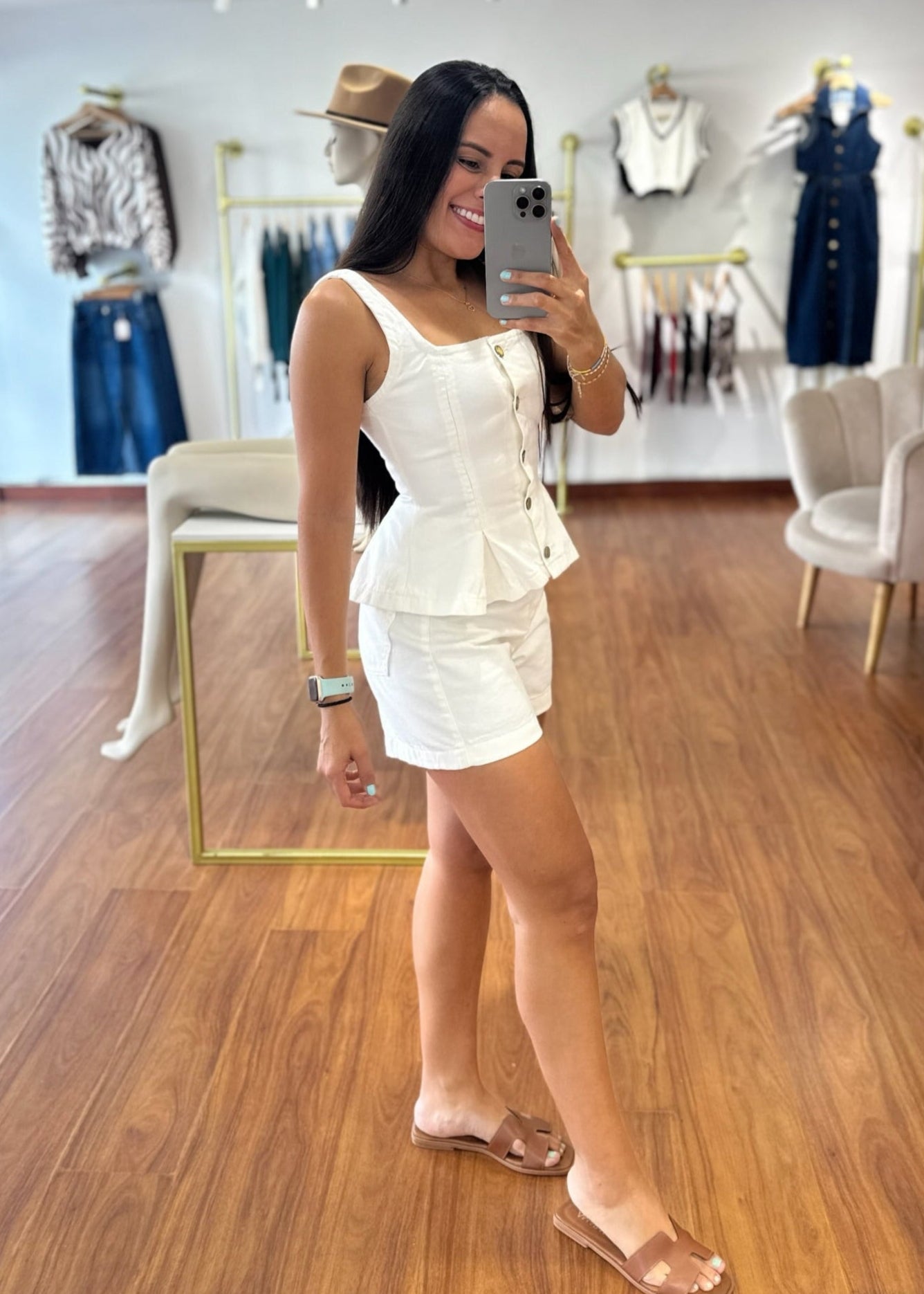 Blusa manga sisa confeccionada en jean color marfil con botones frontales funcionales. Su tela es rigida, se recomienda pedir una talla más de la talla que se es normalmente en blusa.