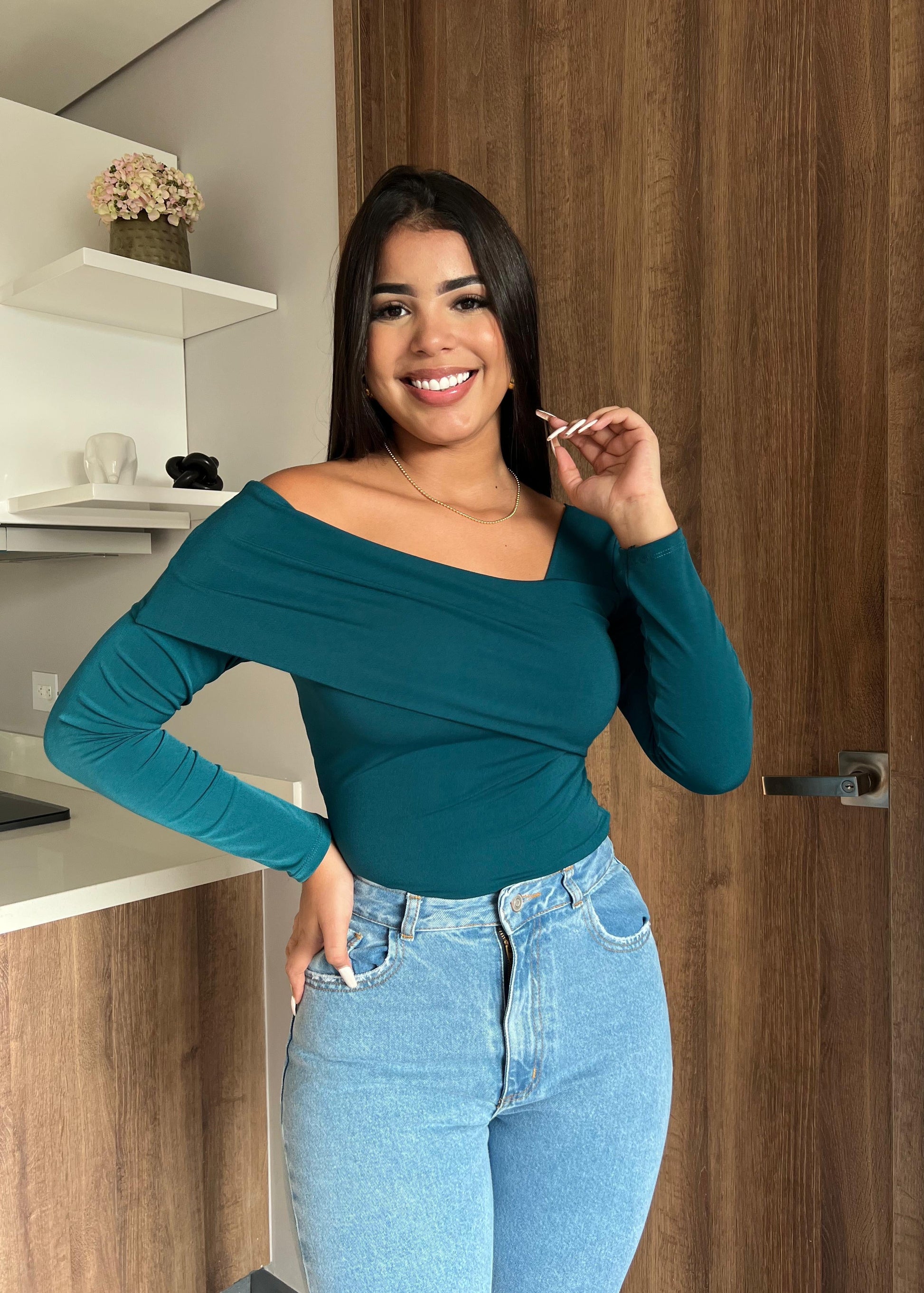 Blusa cuello semi bandeja color turqueza, su tela tiene bastante elasticidad, silueta ajustada y larga.
