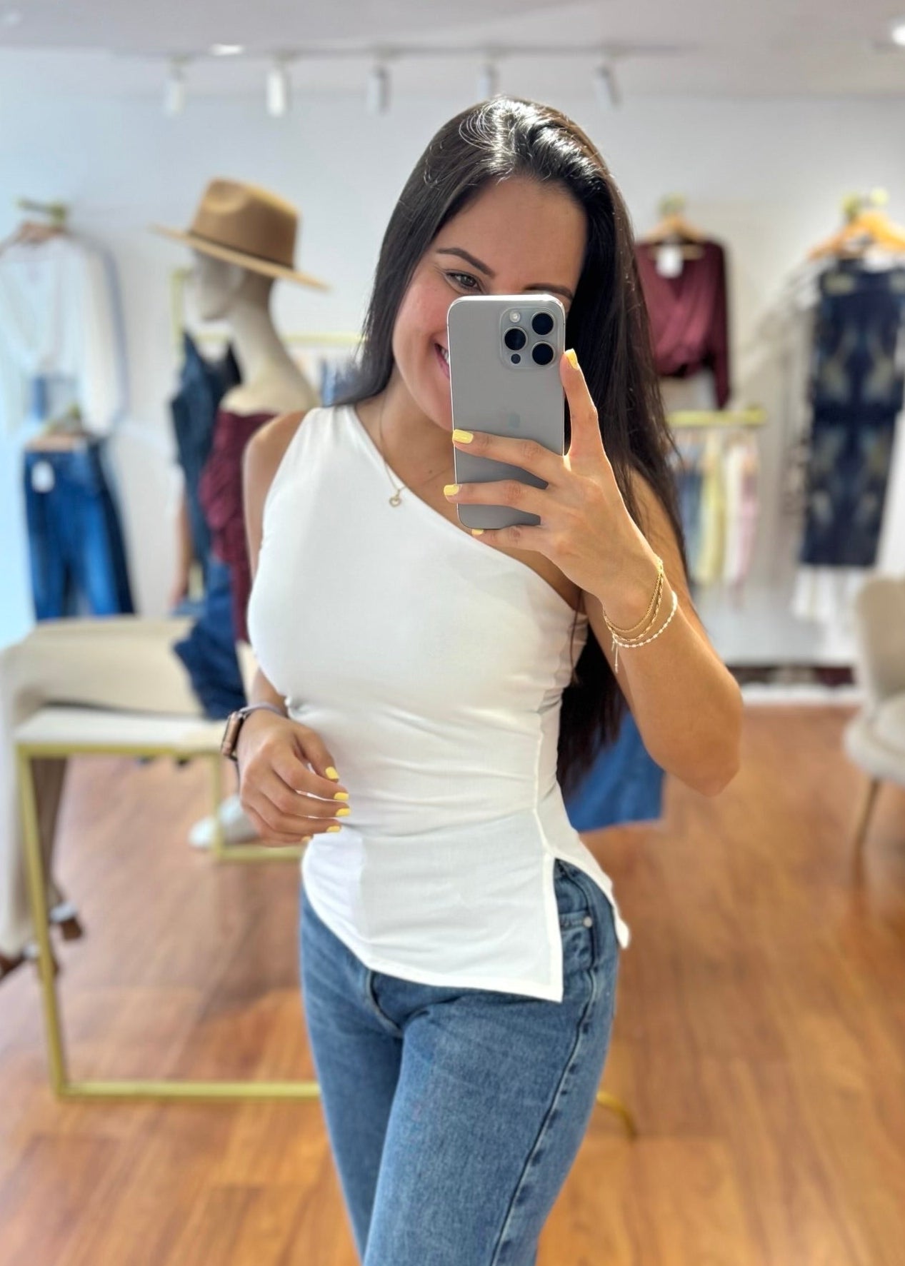 Blusa básica medio beso confeccionada en tela licra. Drapeado en la cintura y con corte asimétrico en la parte inferior.