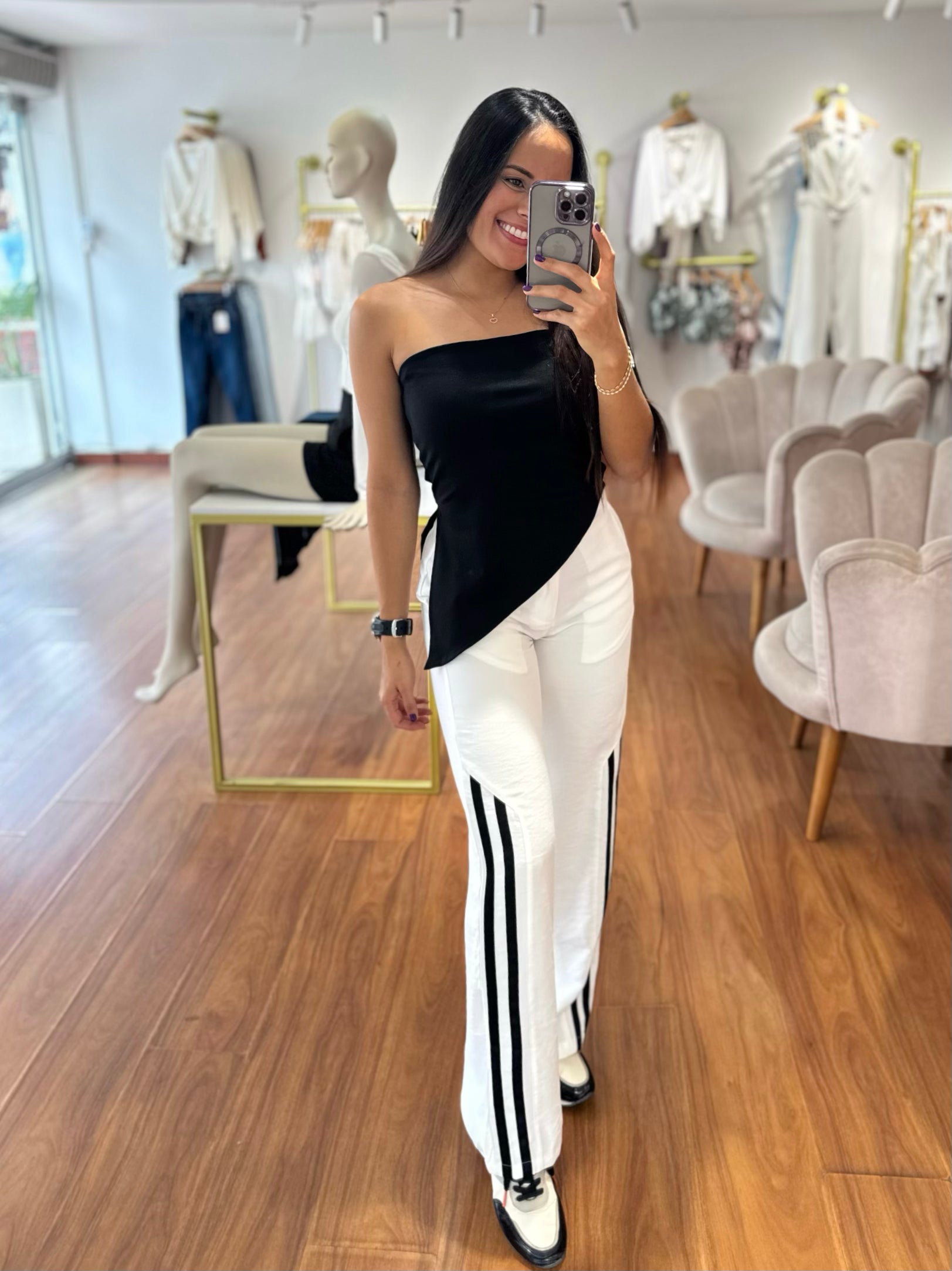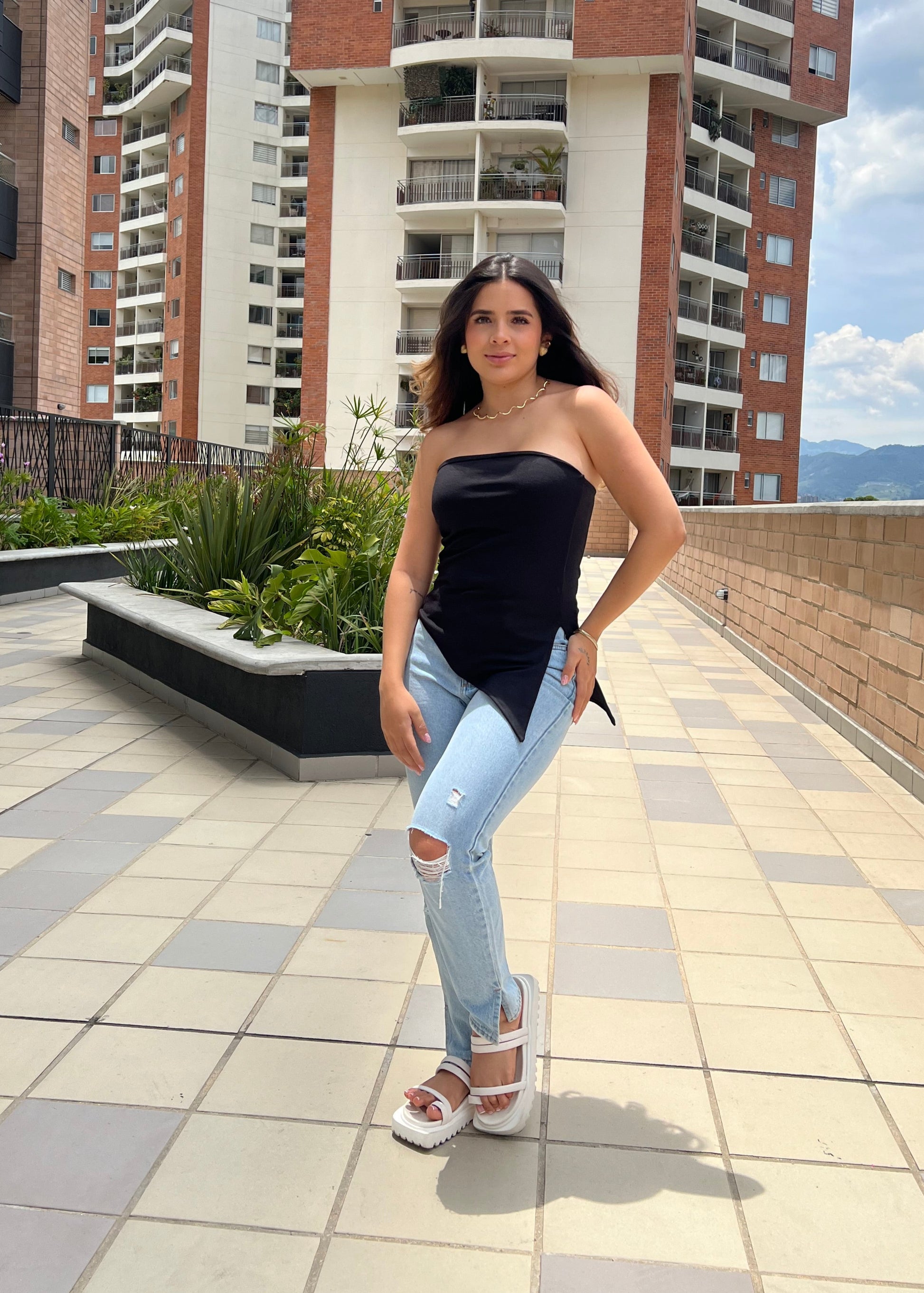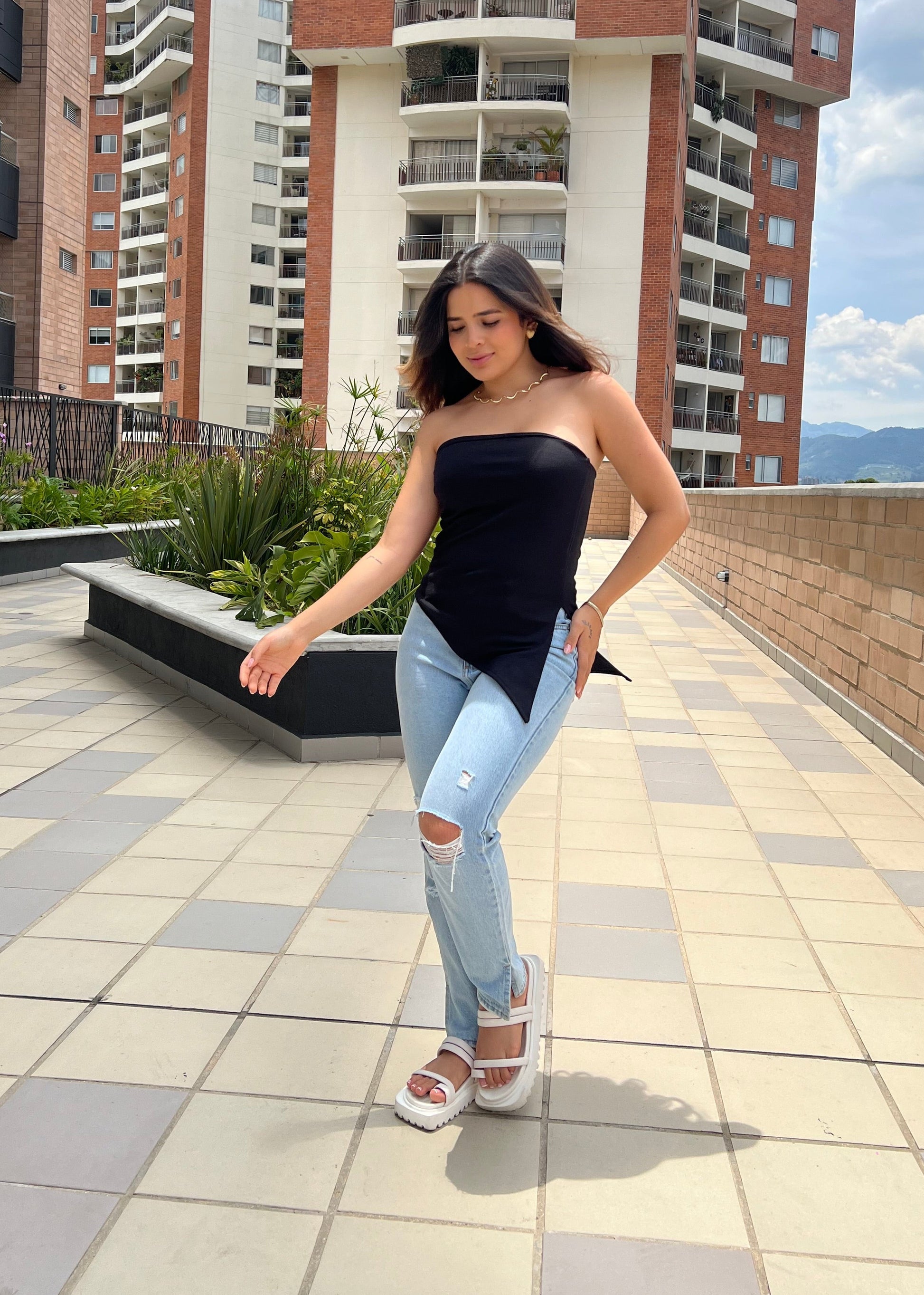 Blusa straple con corte inferior asimetrico y abertura lateral. La tela es stretch (scuba) y forrada en el busto.