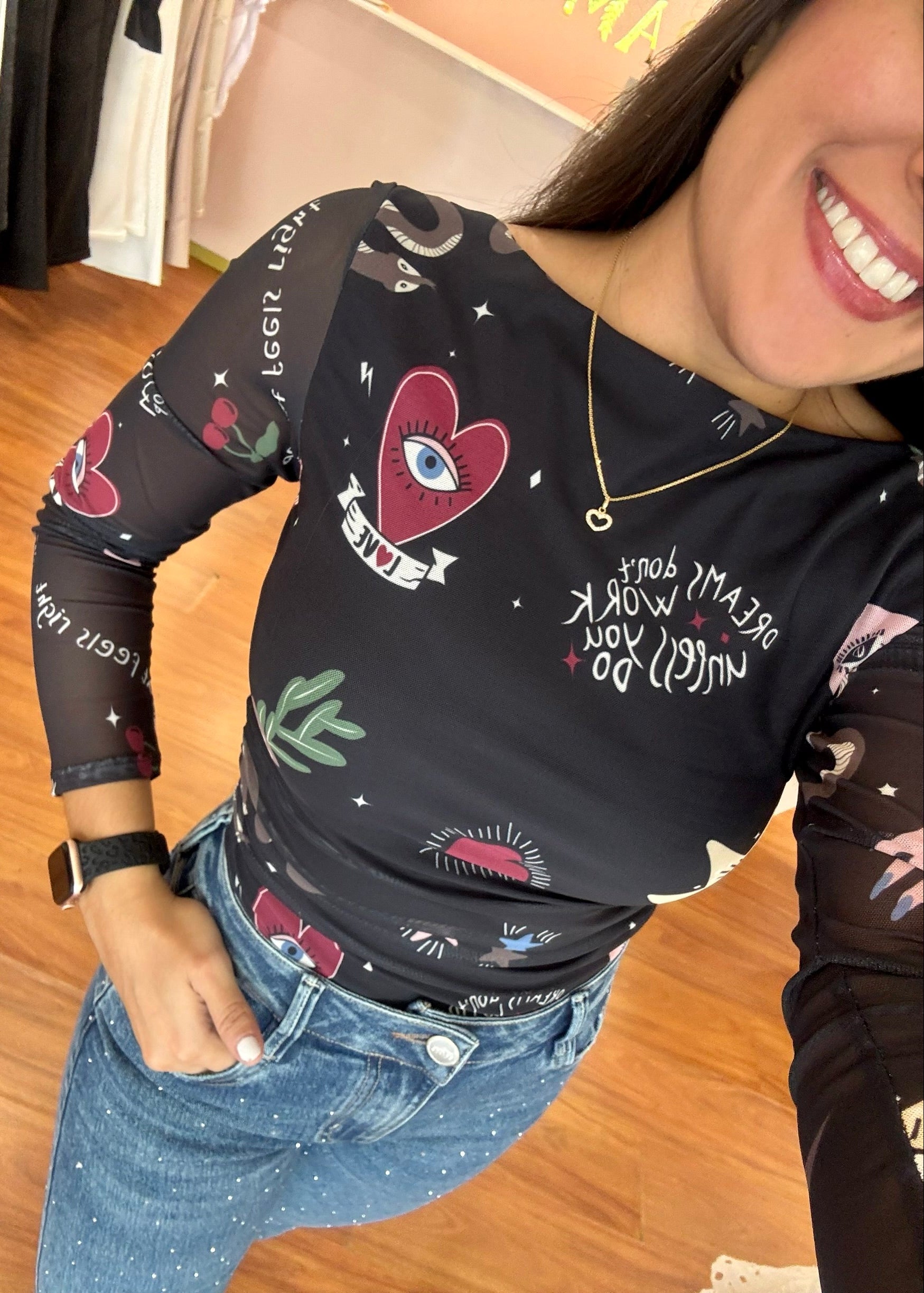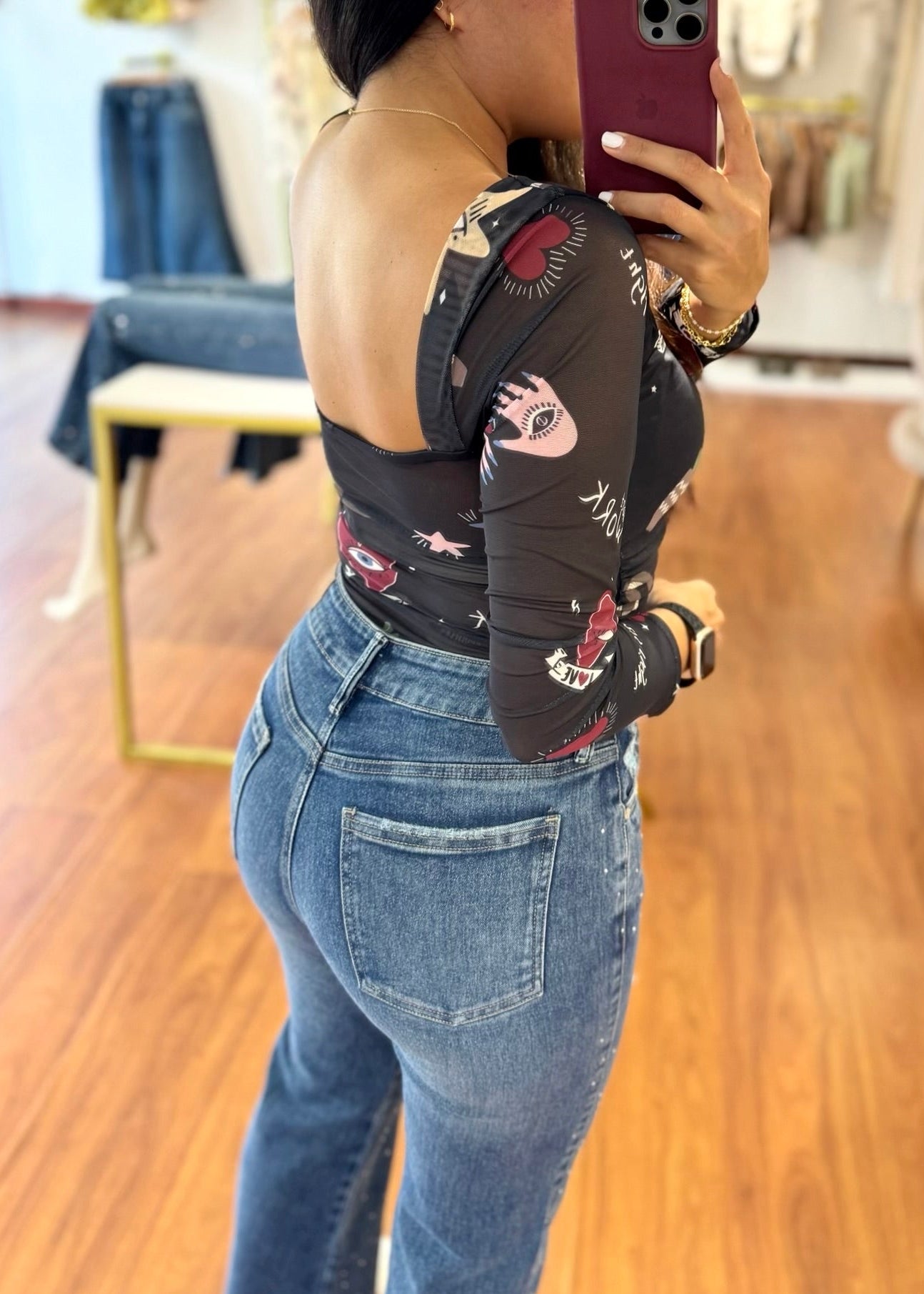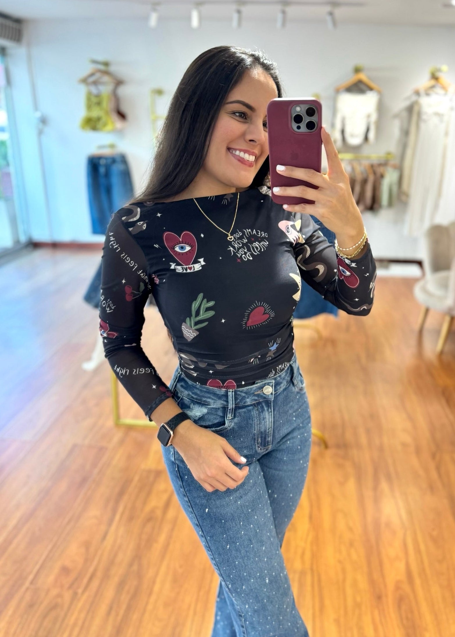 Body manga larga confeccionado en tela mallatex forrado en su parte interna (frente). Talla unica, ideal para tallas S/M/L.