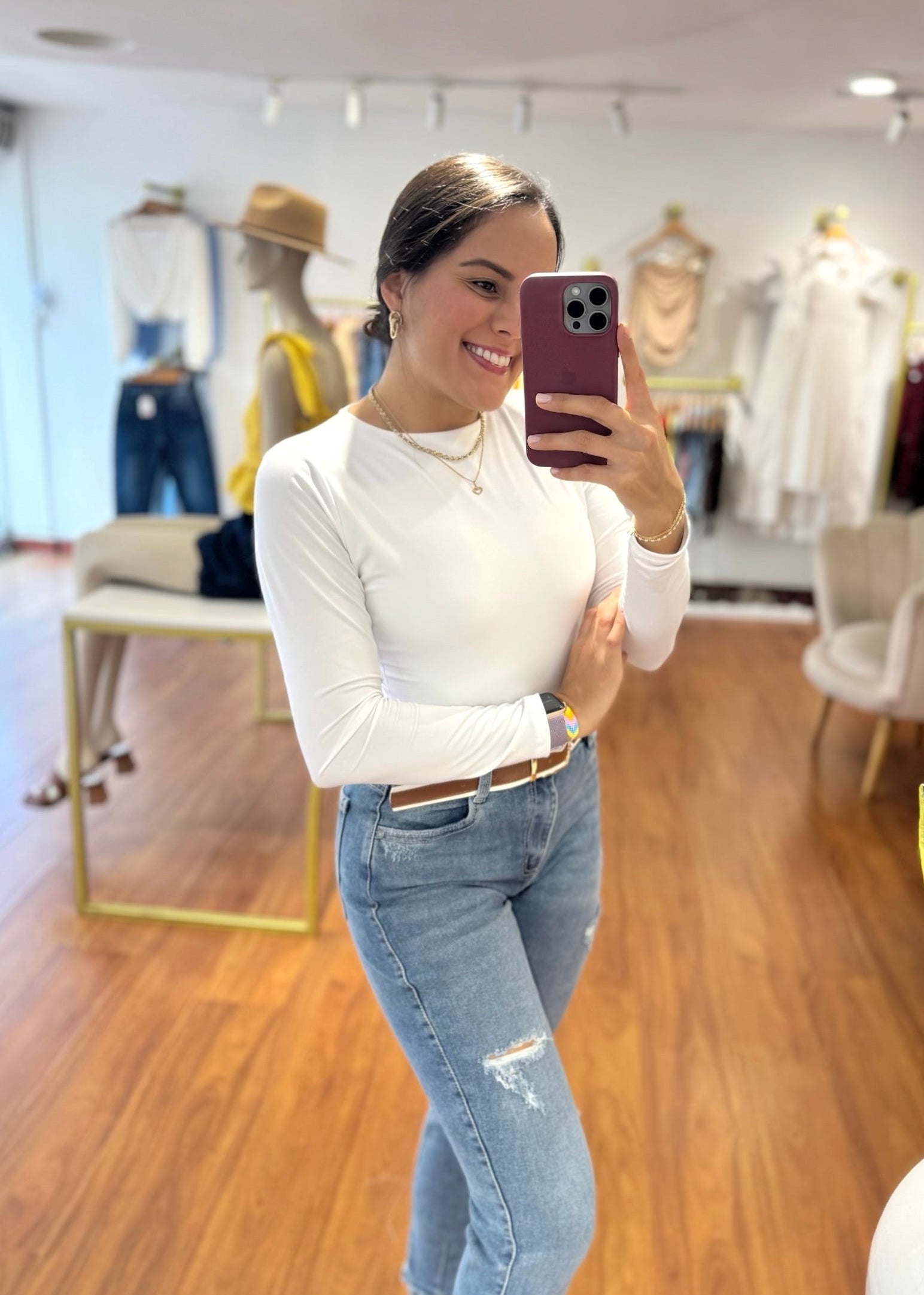 Body manga larga con cuello redondo. Forrado en la parte frontal. Su tela es suave, fresca y con bastante elongación.