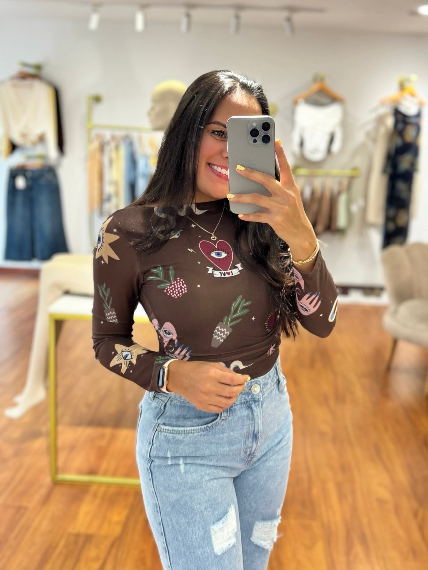 Body manga larga confeccionado en tela mallatex forrado en su parte interna (frente). Talla unica, ideal para tallas S/M/L.