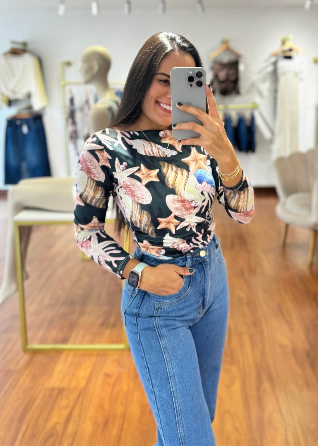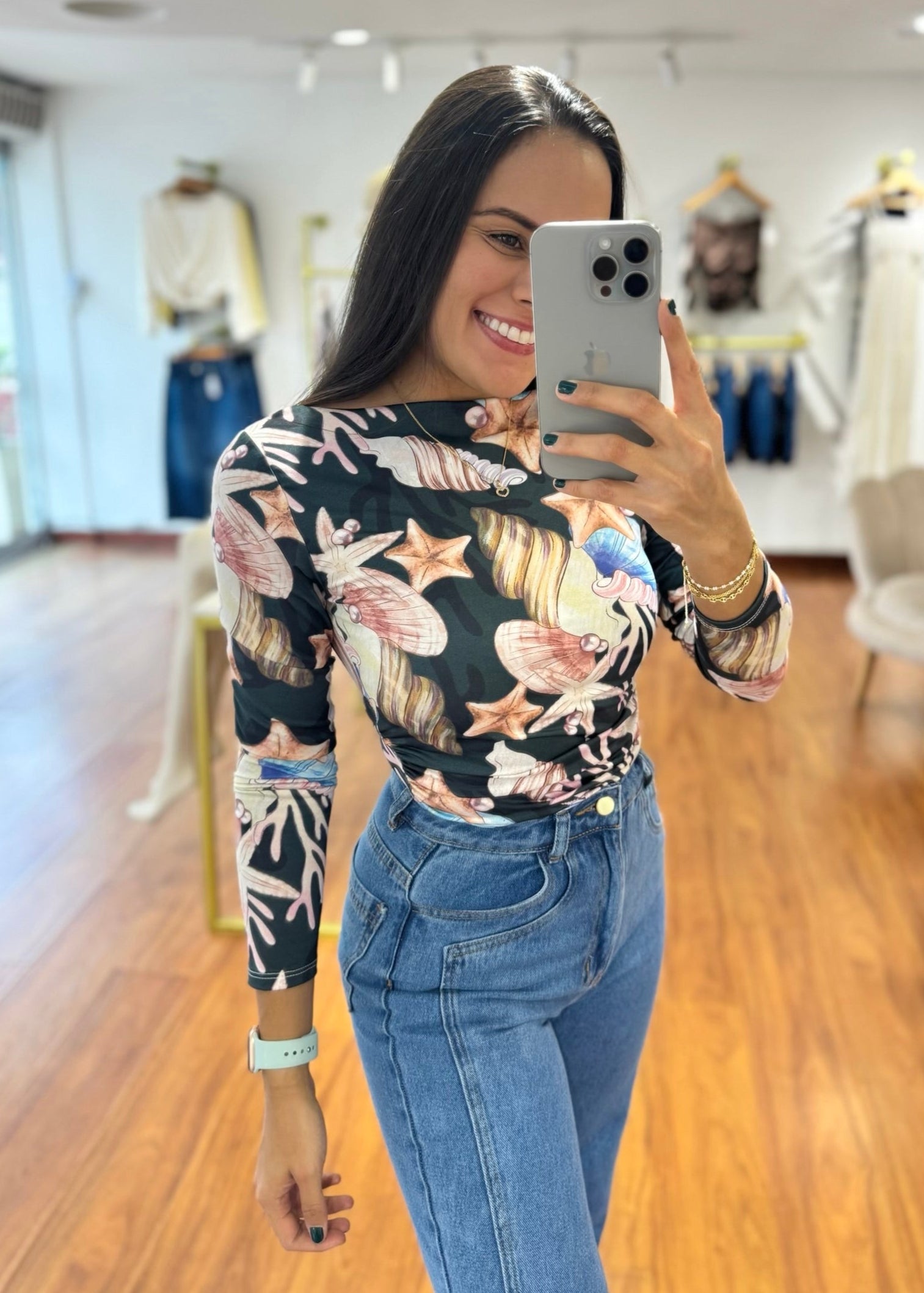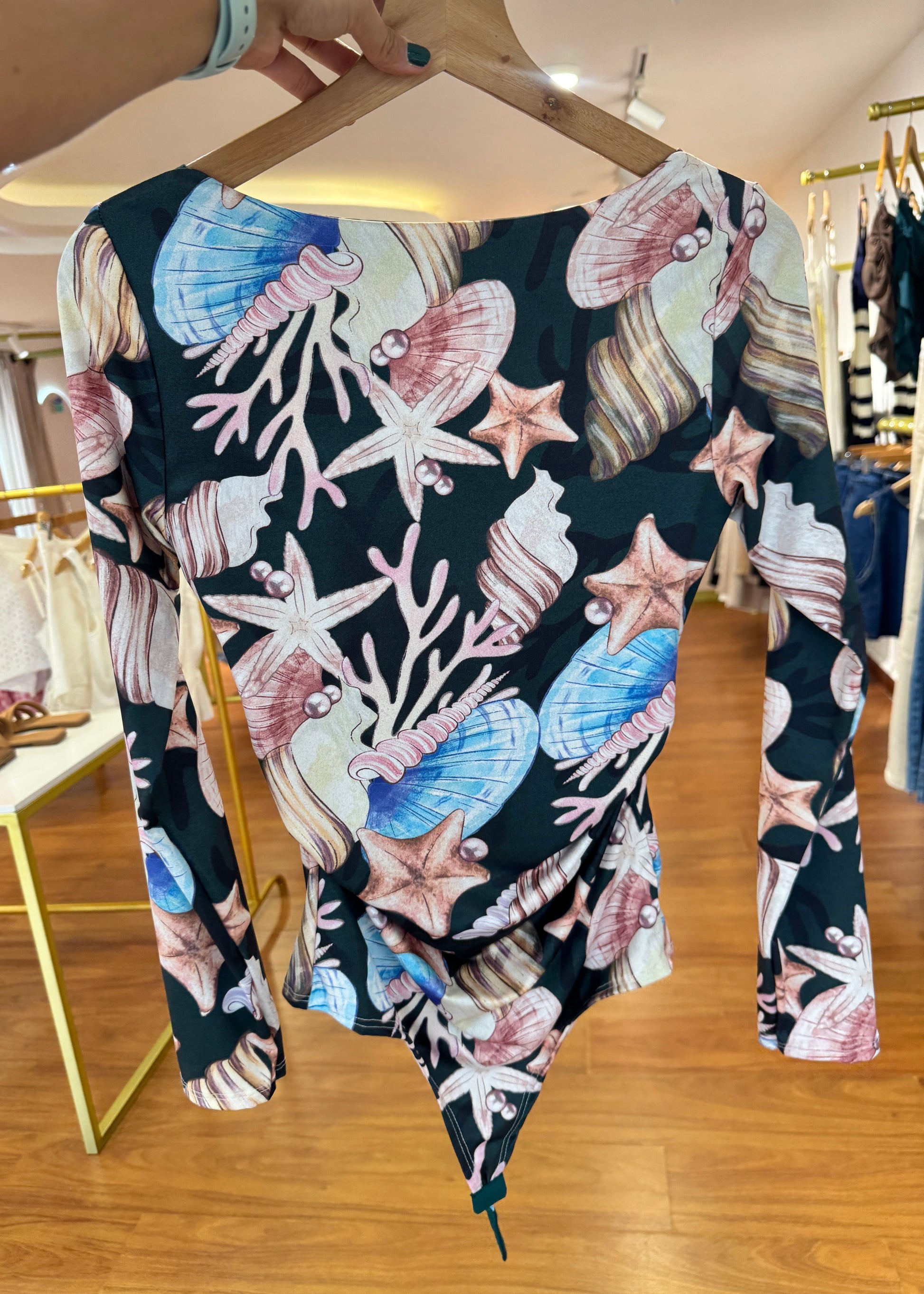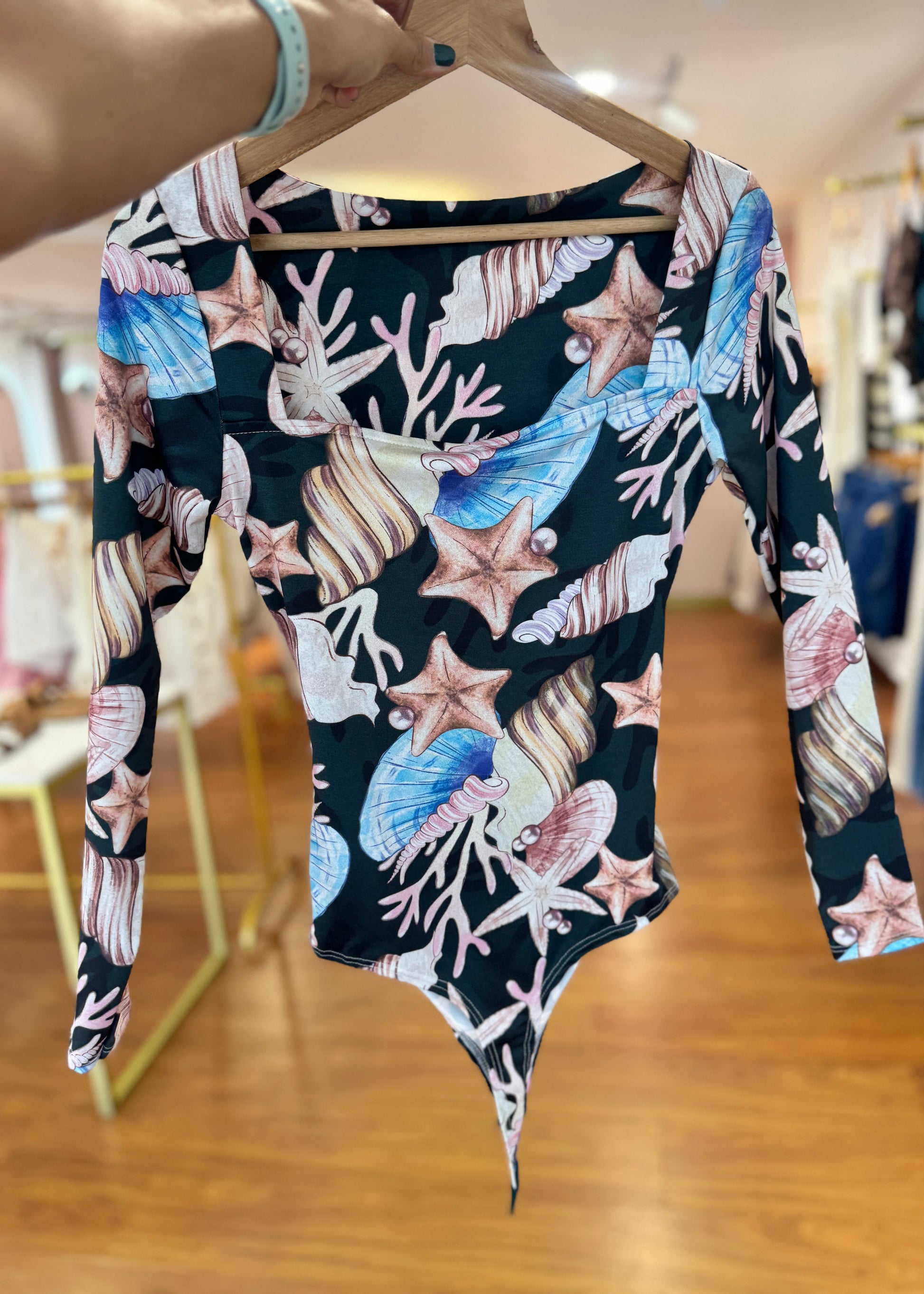 Body manga larga en tela piel de durazno fondo verde estampado. Su tela es suave y adaptable a tu cuerpo. Talla unica, sirve para S M y L.