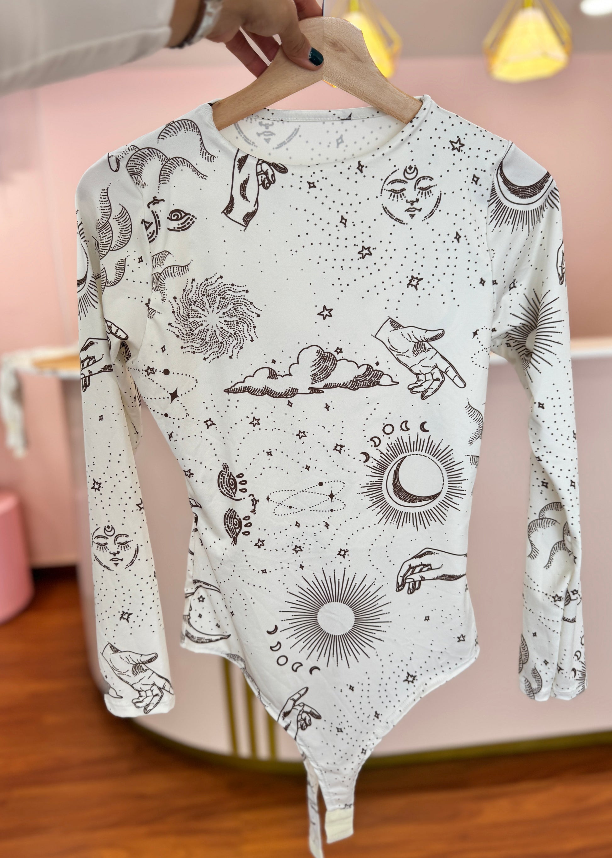 Body manga larga en color blanco con estampado en color cafe. Confeccionado en tela suave y con bastante elongacion, se adapta al cuerpo. Talla unica, ideal para tallas S/M y hasta L.
