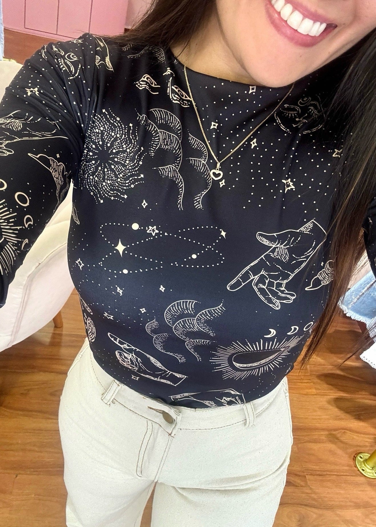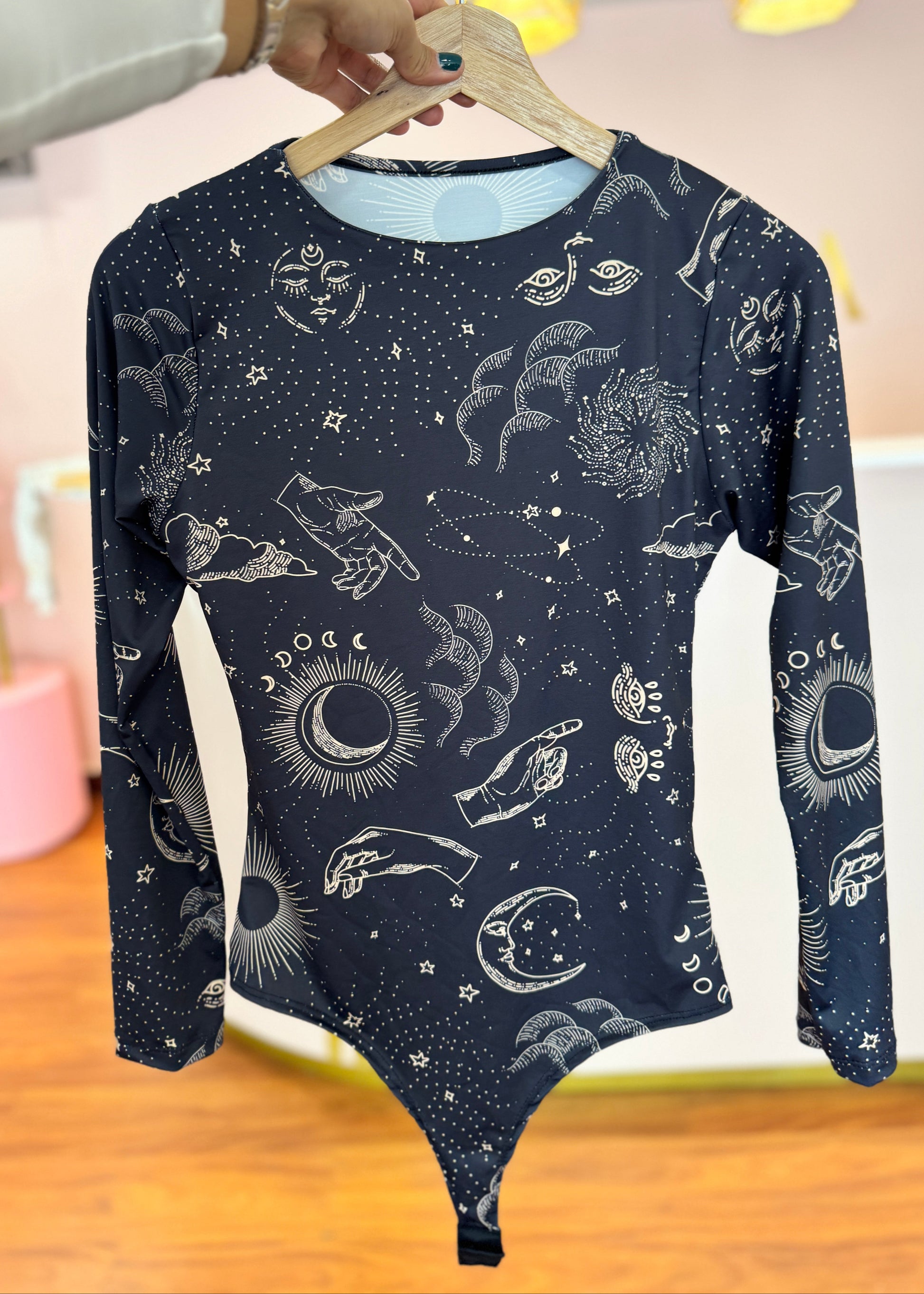 Body manga larga en color negro con estampado en color crema. Confeccionado en tela suave y con bastante elongacion, se adapta al cuerpo. Talla unica, ideal para tallas S/M y hasta L.
