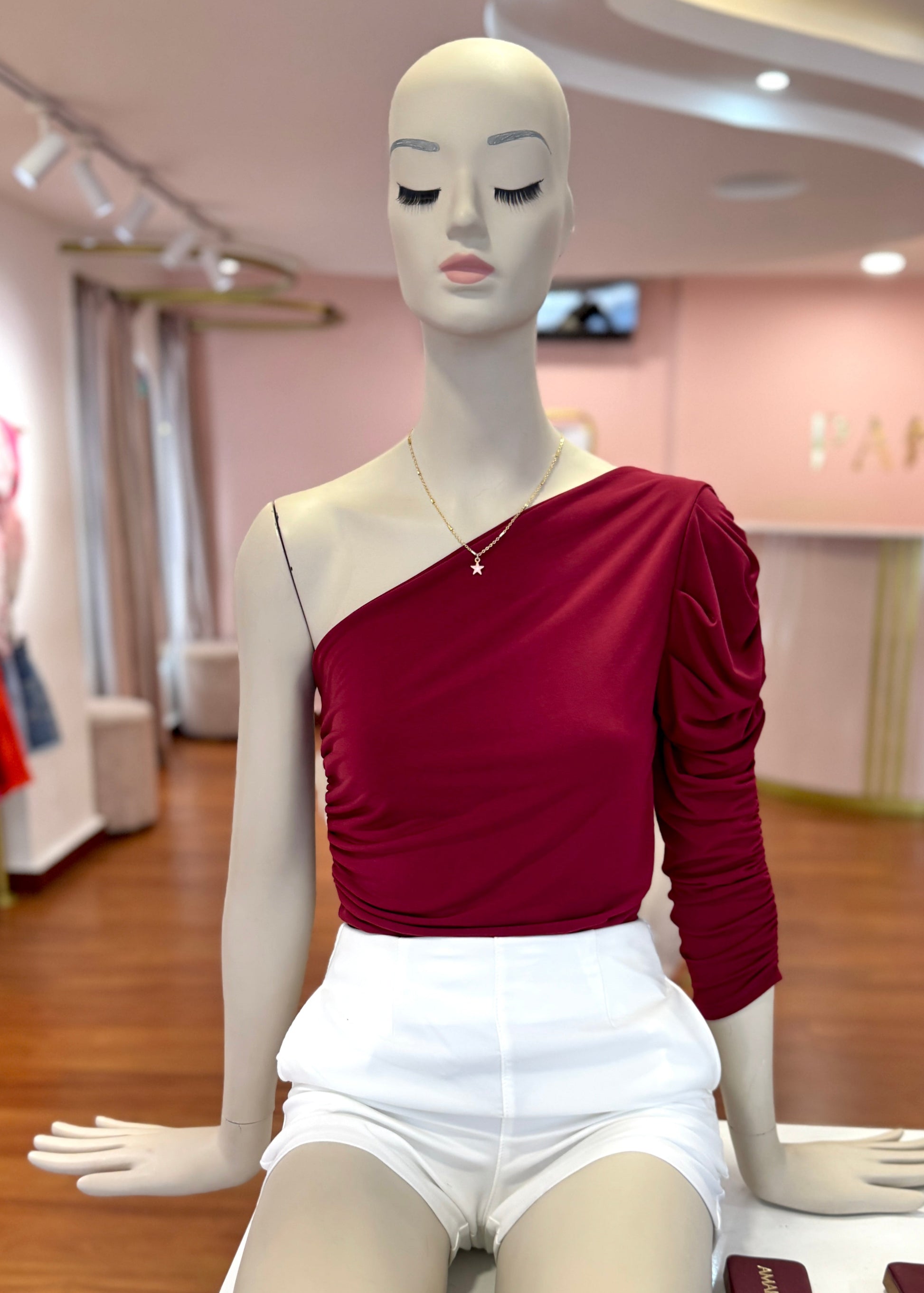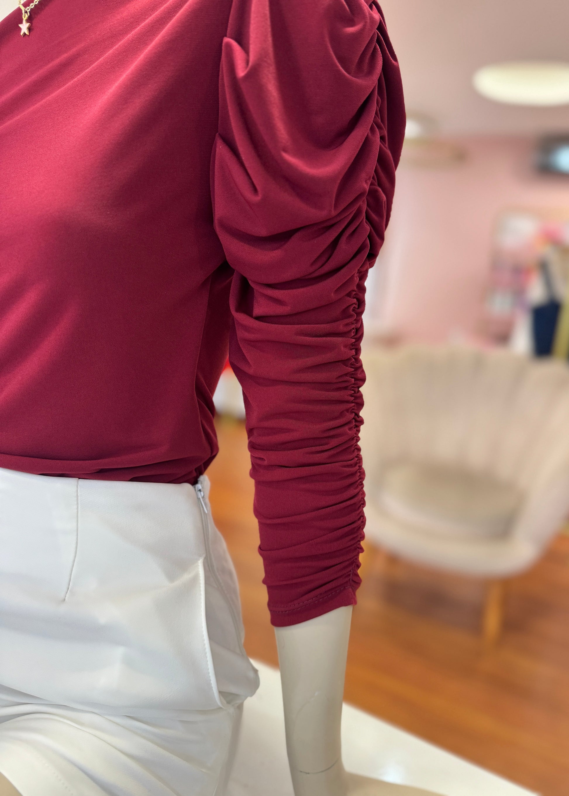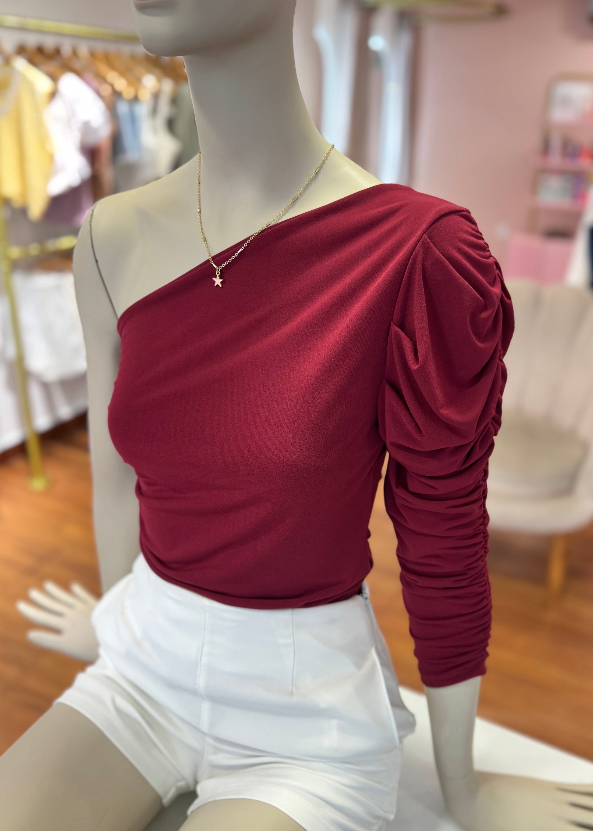 Body color vino tinto con corte asimetrico medio beso con manga larga fruncida. Su tela es bastante elastica, sirve para tallas SM y hasta L.