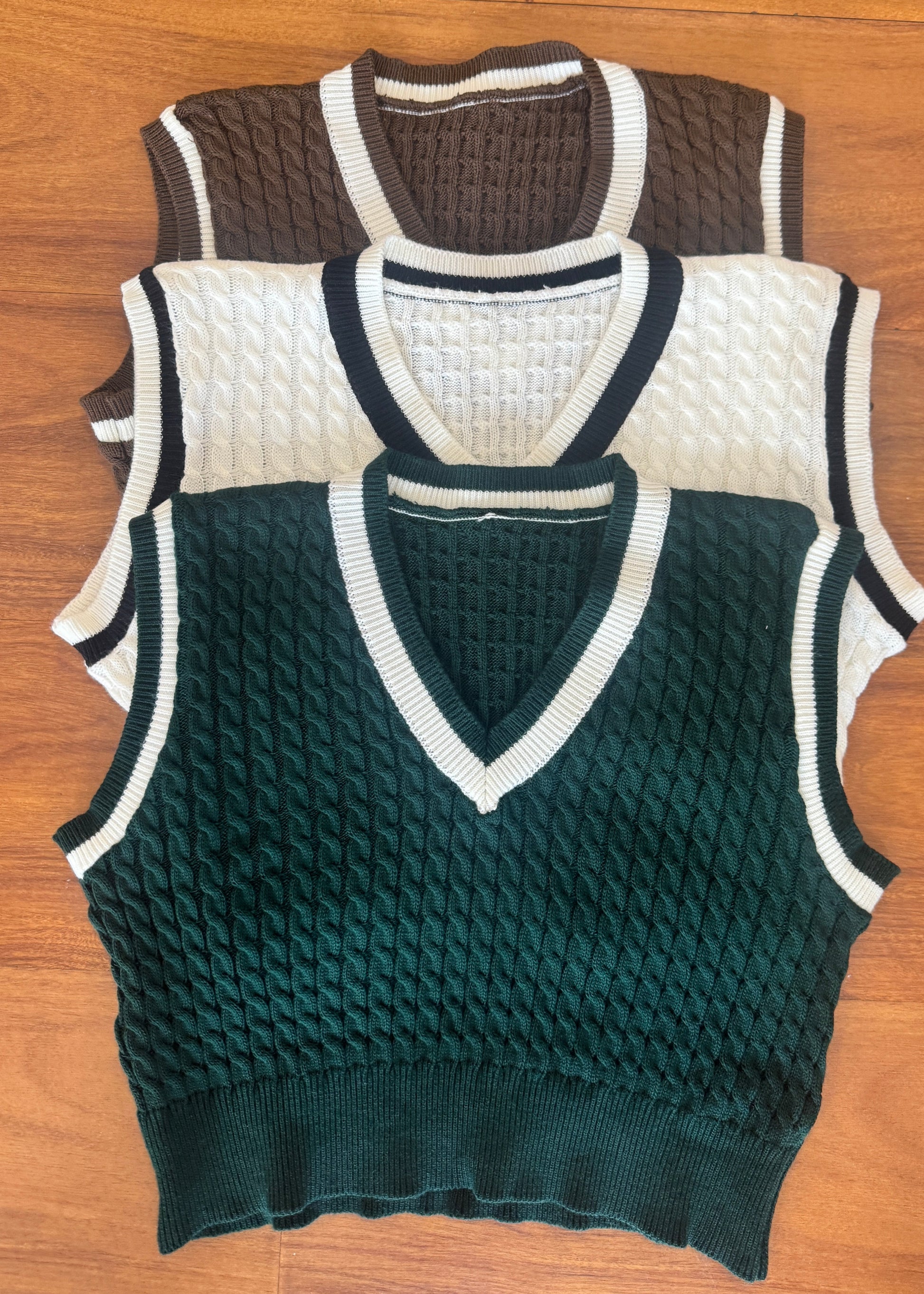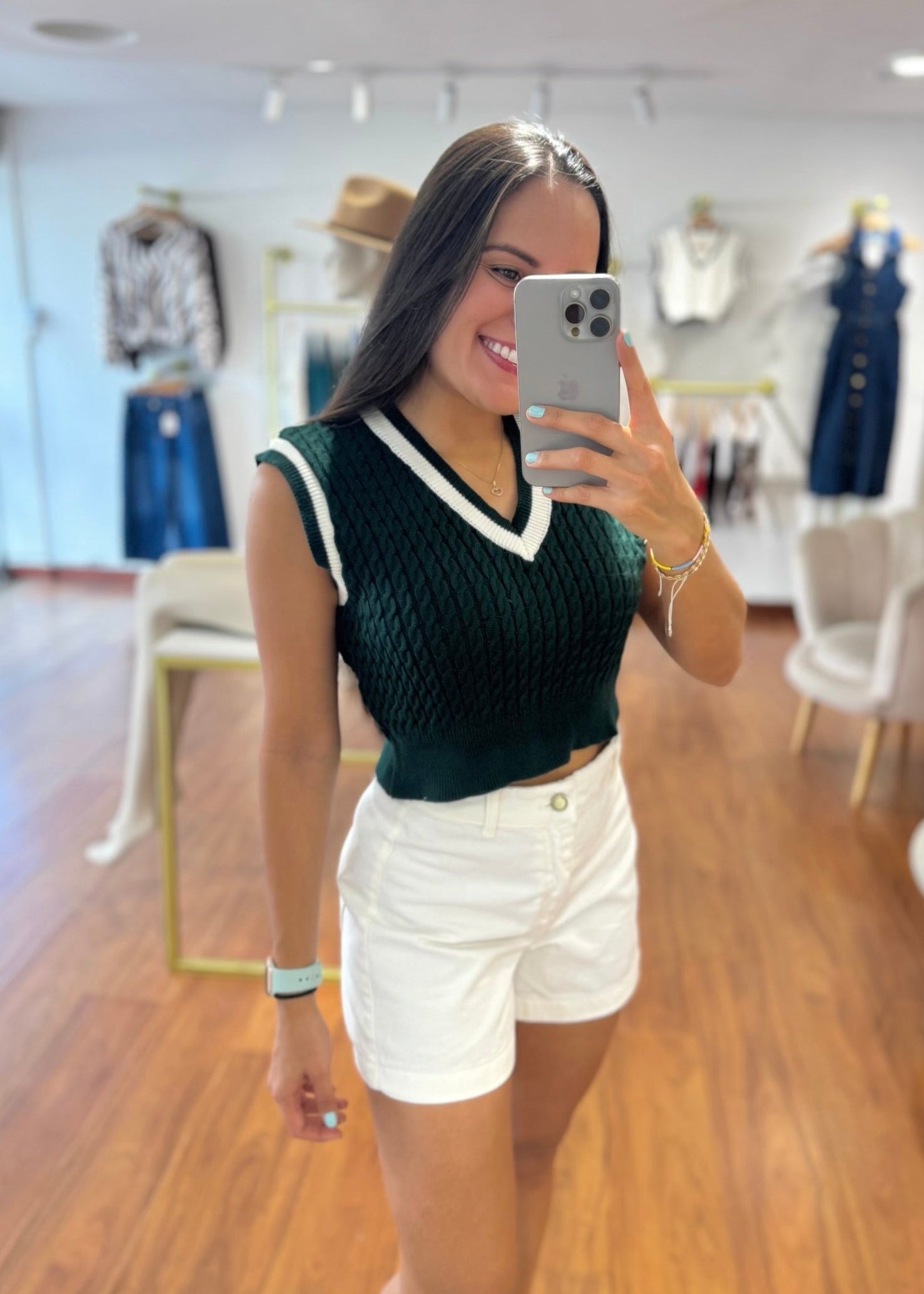 Chaleco corto tejido trenzado con cuello en V y manga sisa. Es talla unica y su tejido es bastante elastico.
