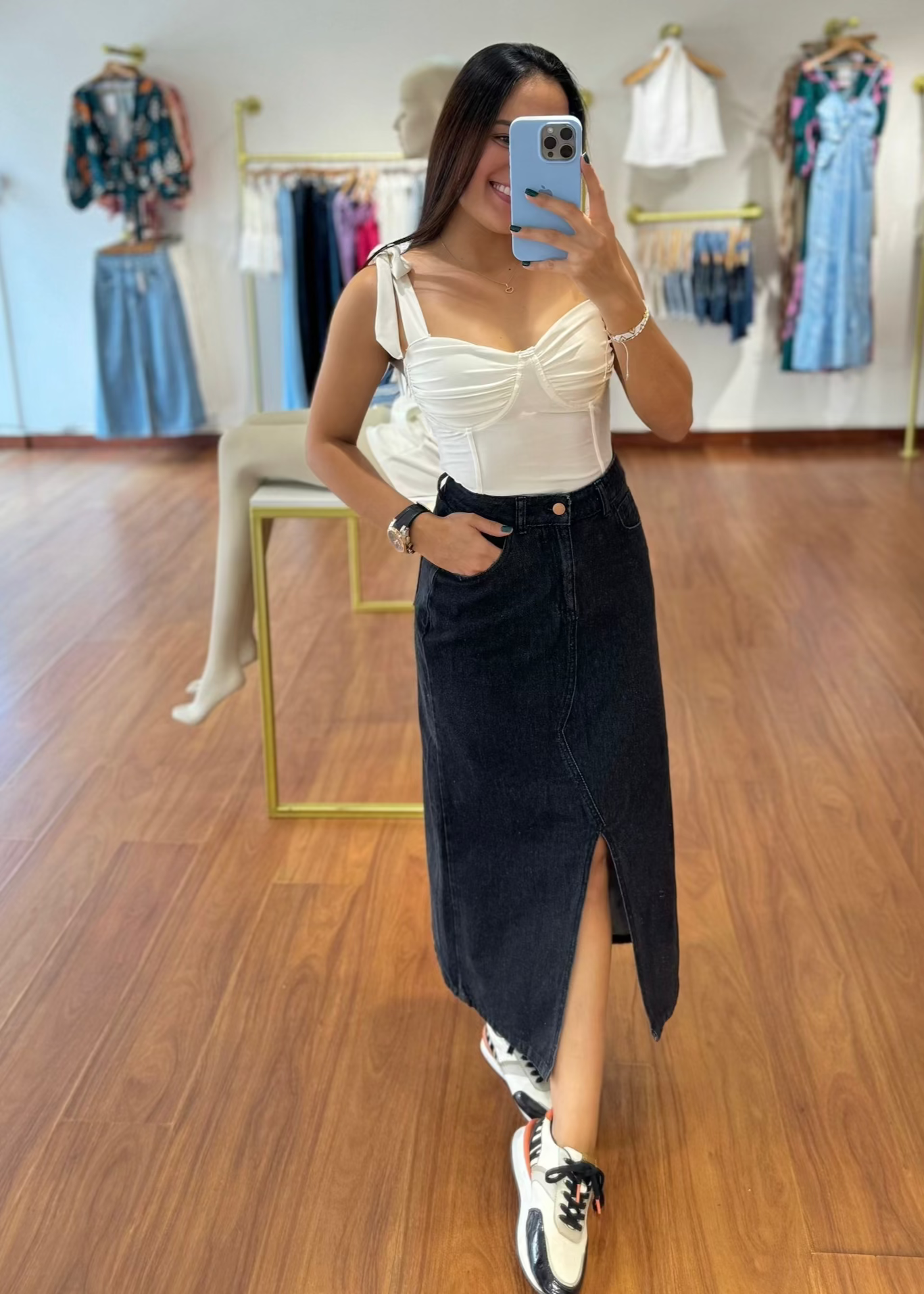 Falda en denim rigido color negro grisáceo. Su tela es rigida y tiene bolsillos adelante ya atras.
