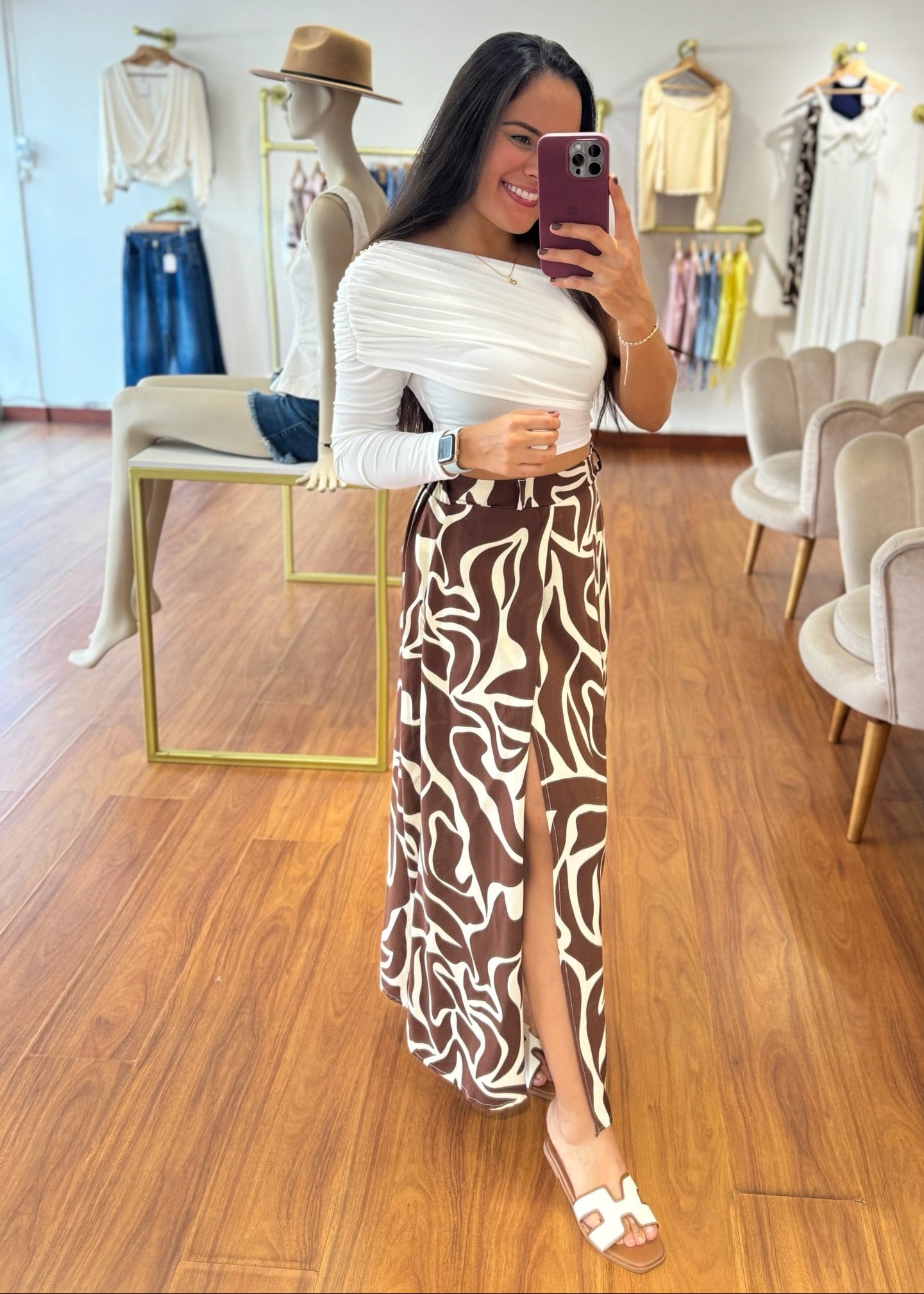 Falda larga color cafe con crema con abertura y en tela fresca. La pretina es encauchada, sirve especialmente para tallas 6/8/10 (S/M).