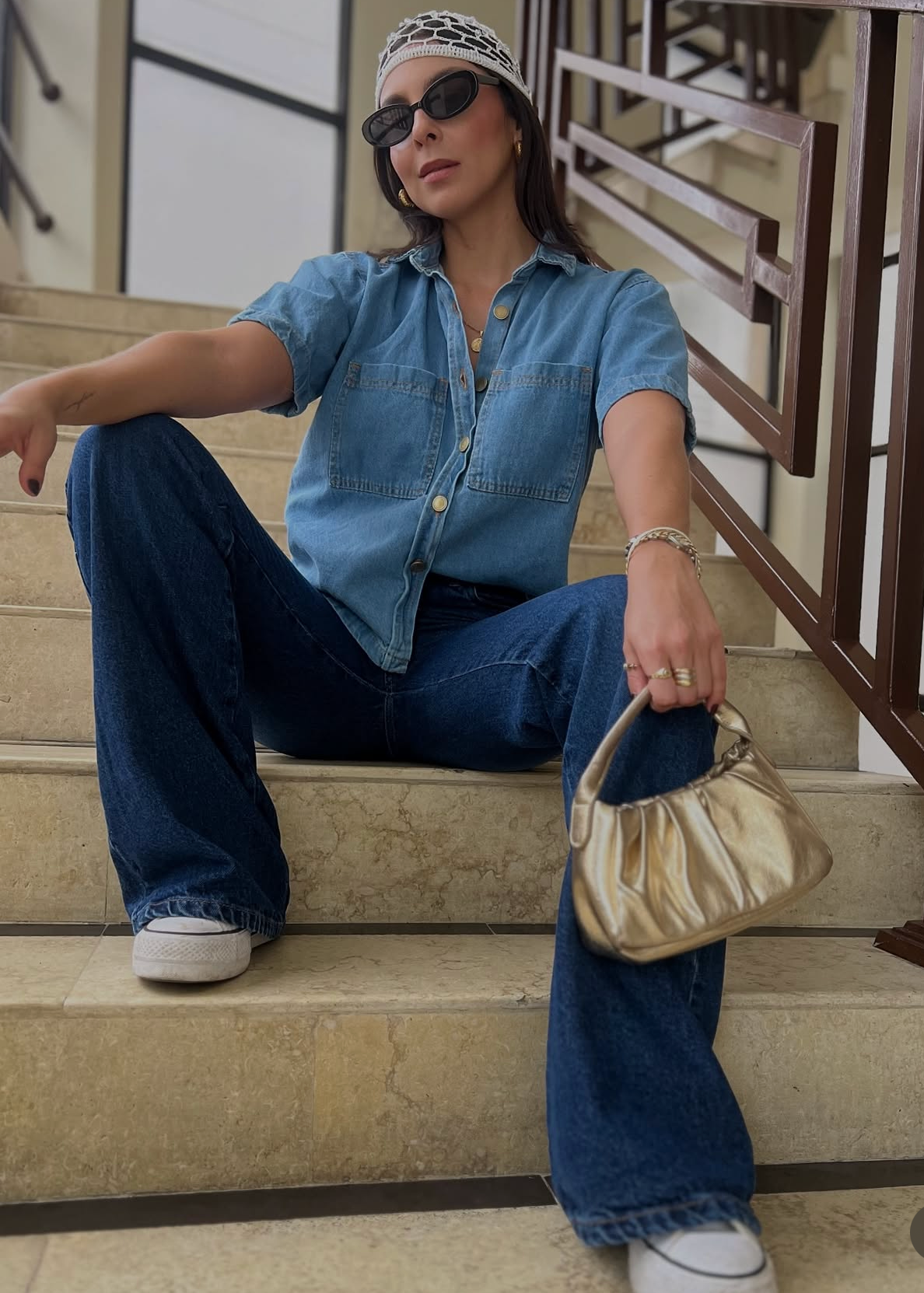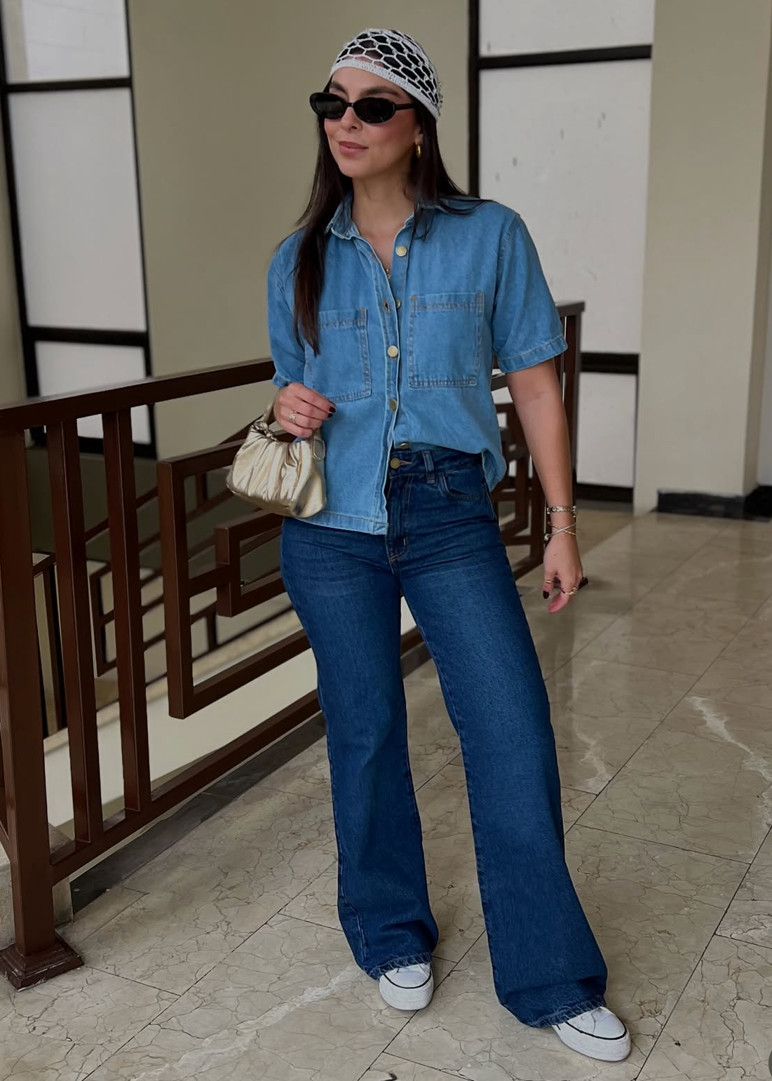 Jean de tiro alto con corte de bota recto, bolsillos traseros clasicos y confeccionado en tela denim rigido.