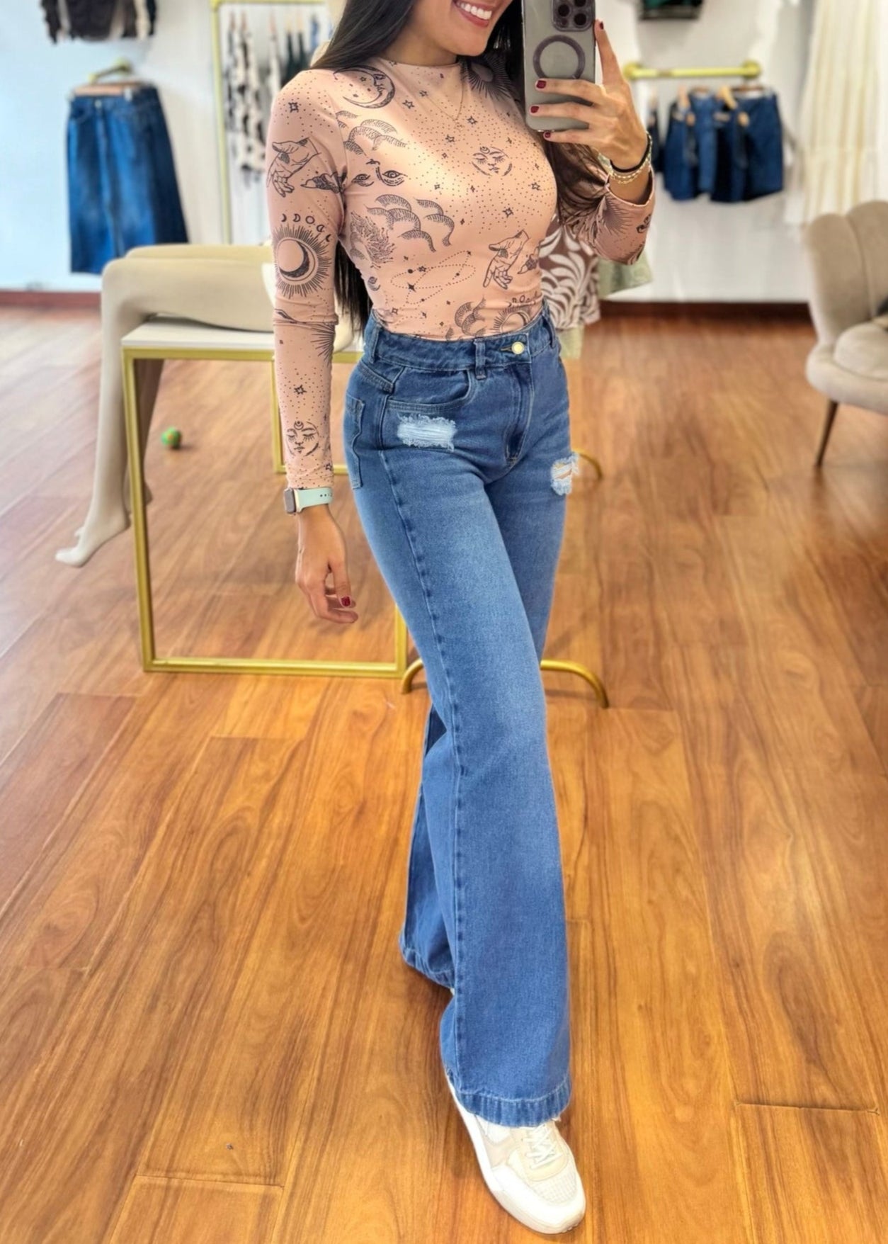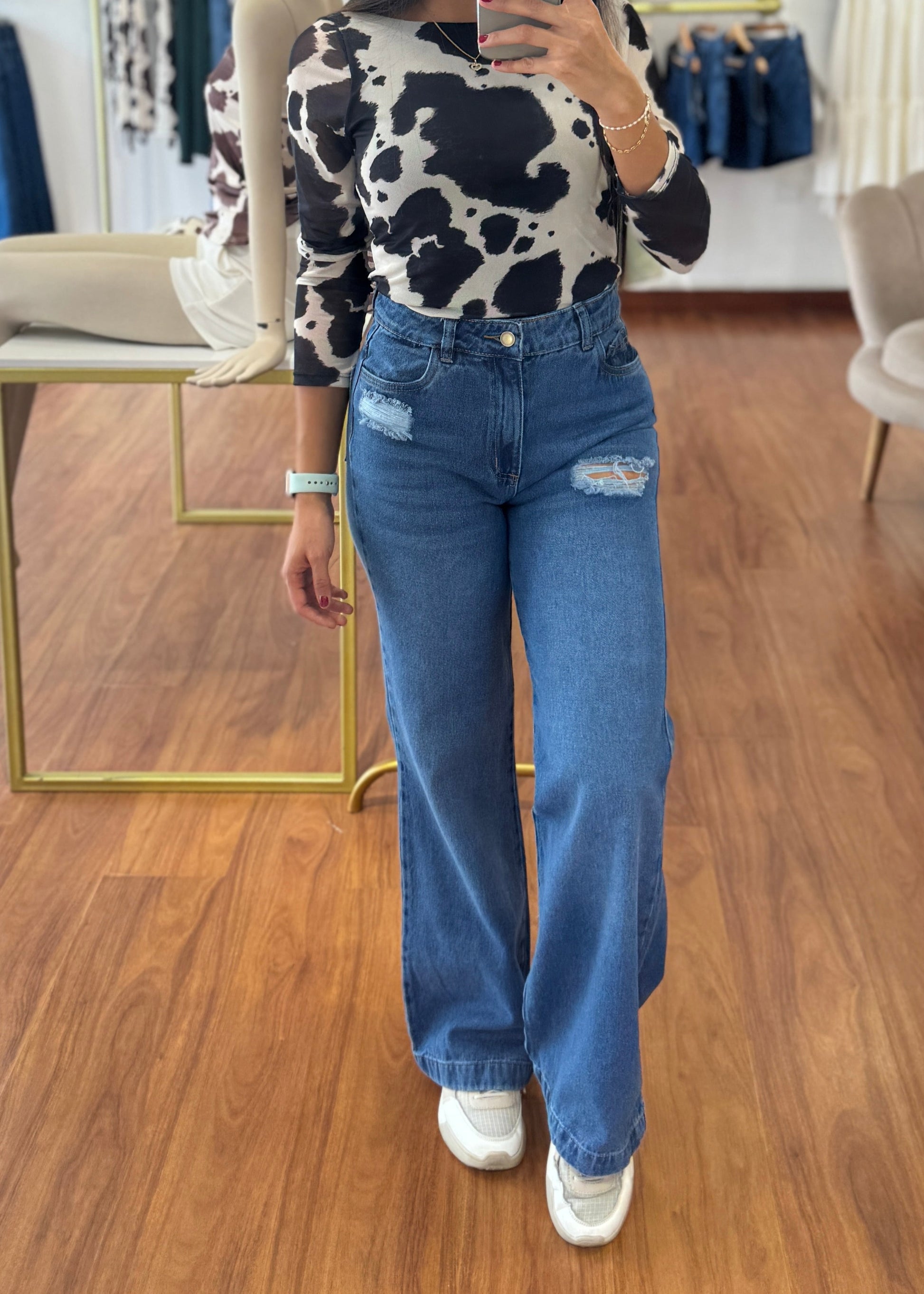 Jean bota ancha tiro alto en denim rigido azul medio con detalles de rasgado delicado en los bolsillos. Tiene bolsillos frontales y traseros clasicos.