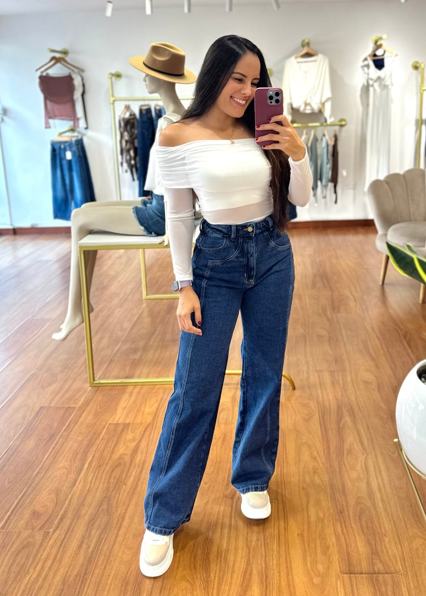 Jean wide leg tiro alto, ideal para realzar y estilizar tu figura. Confeccionado en denim rígido azuloscuro, con bolsillos clásicos delanteros y traseros.