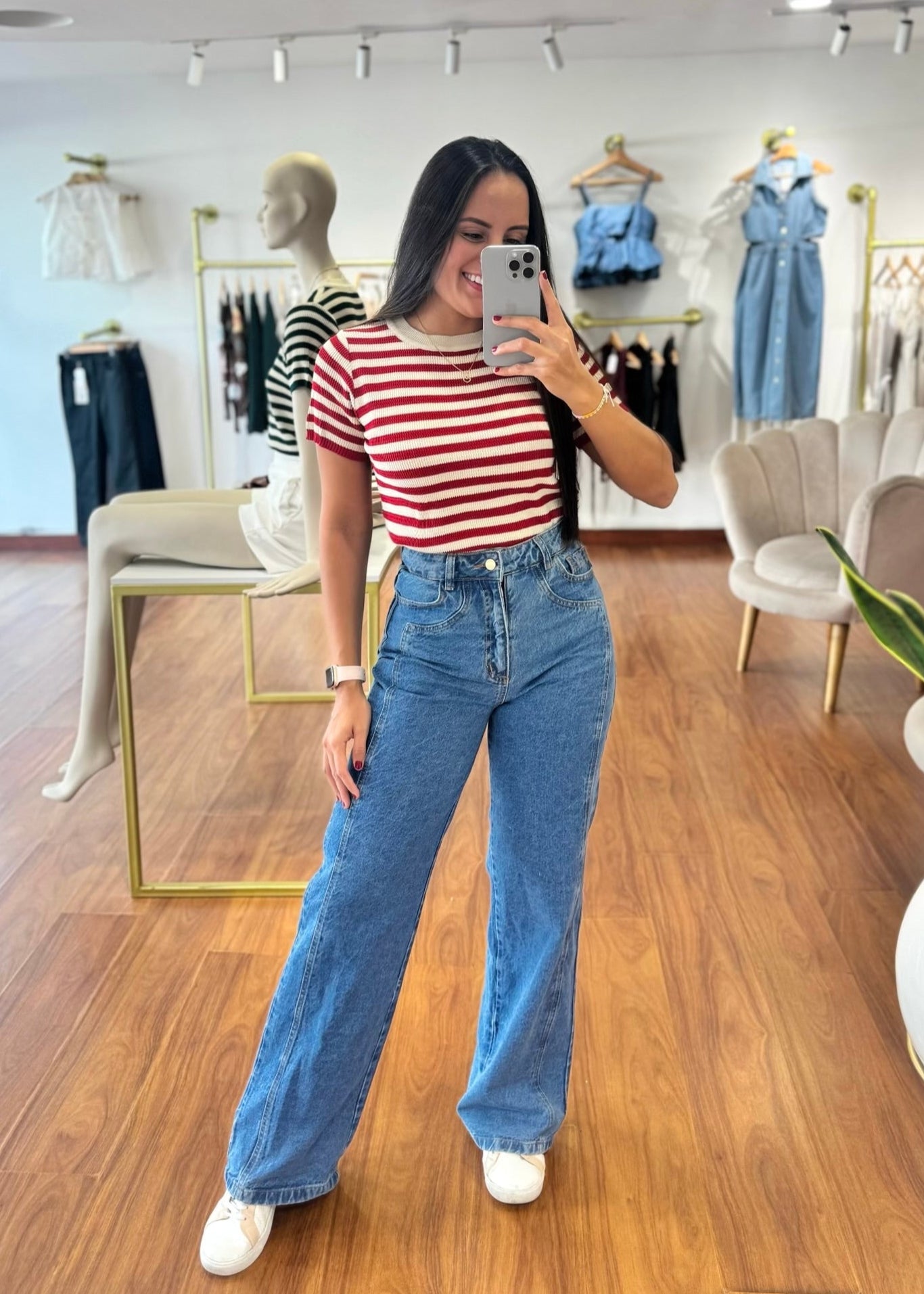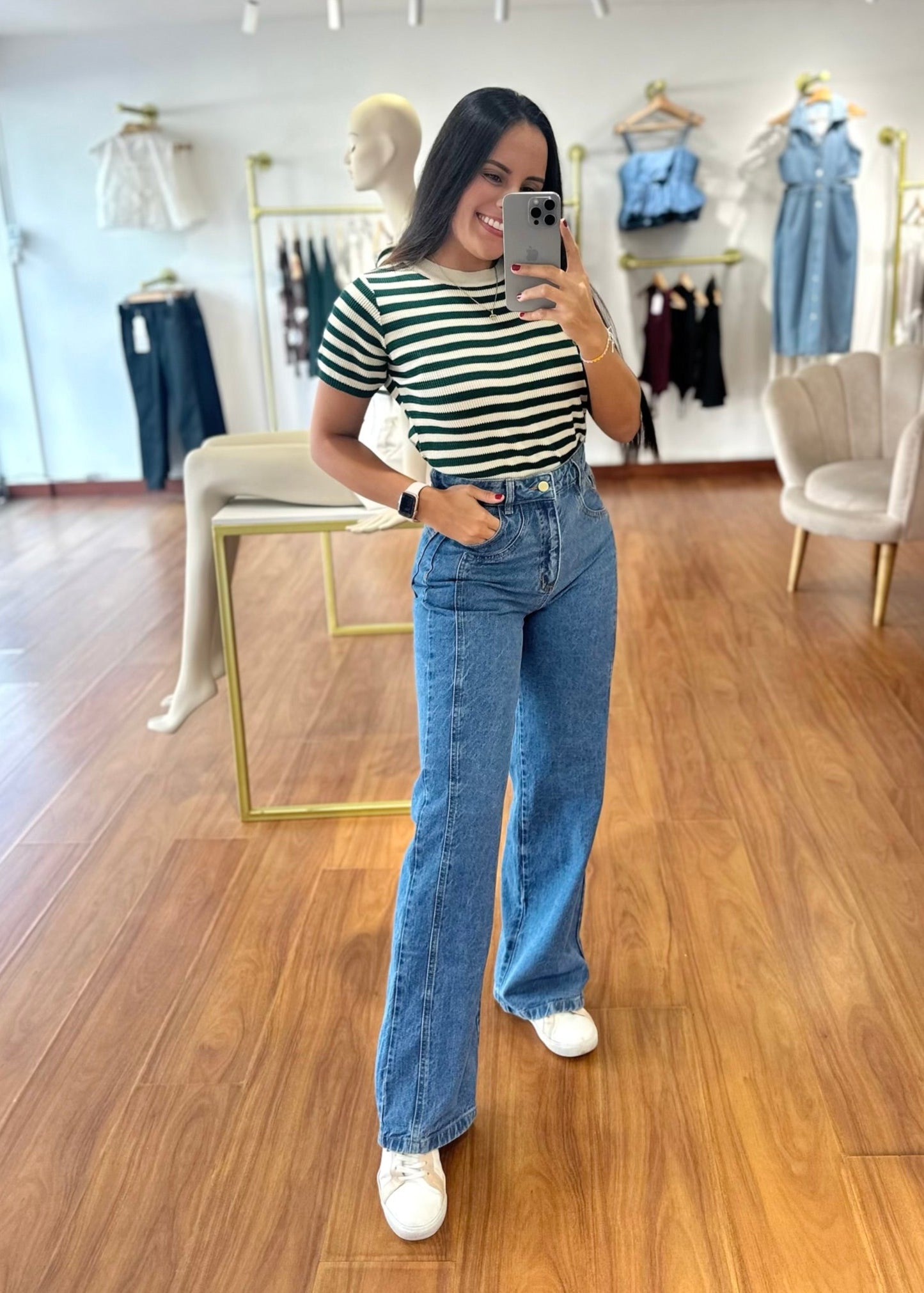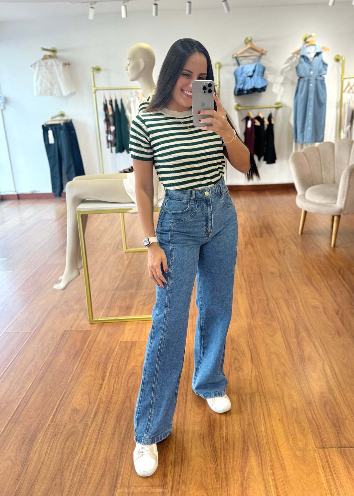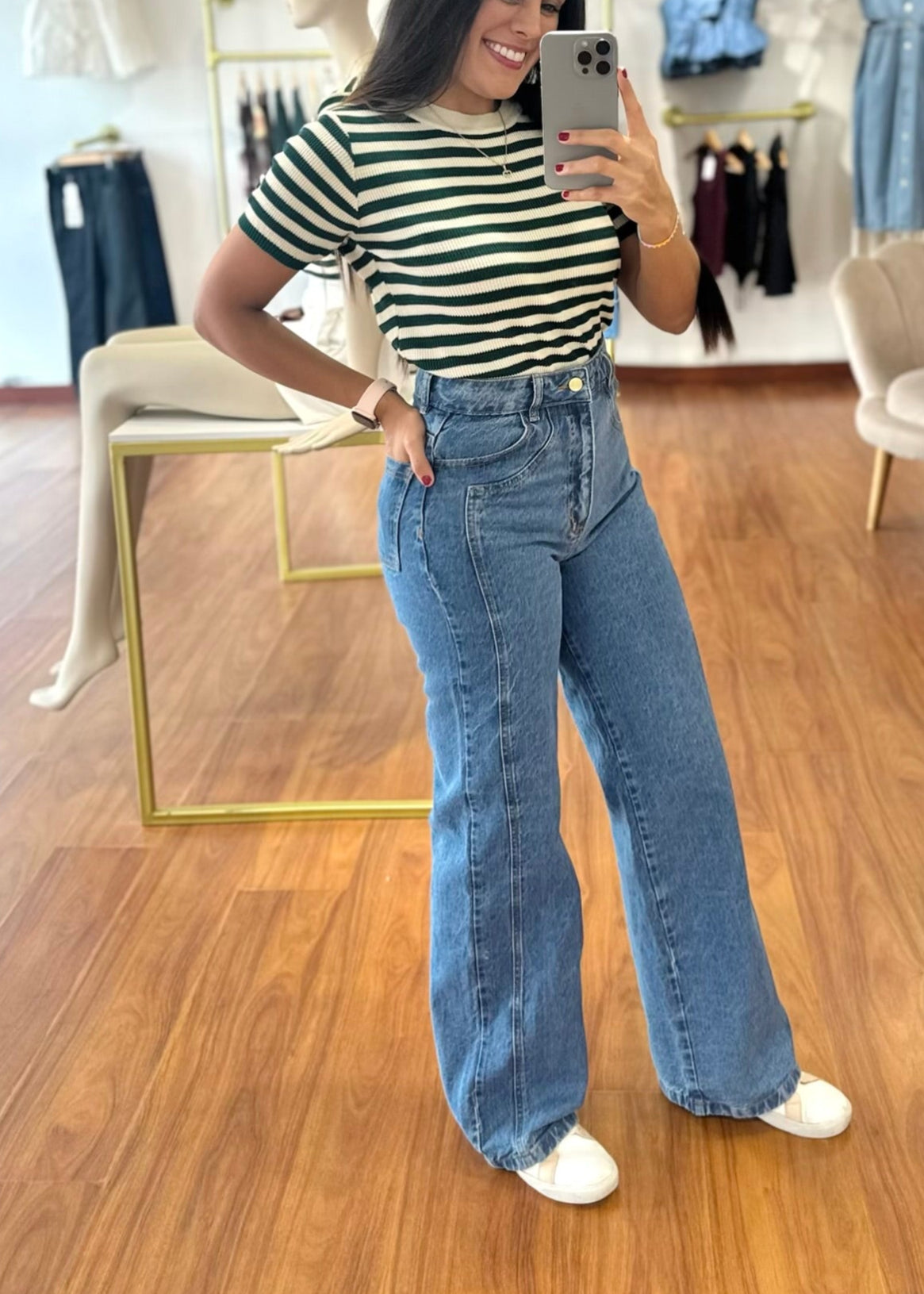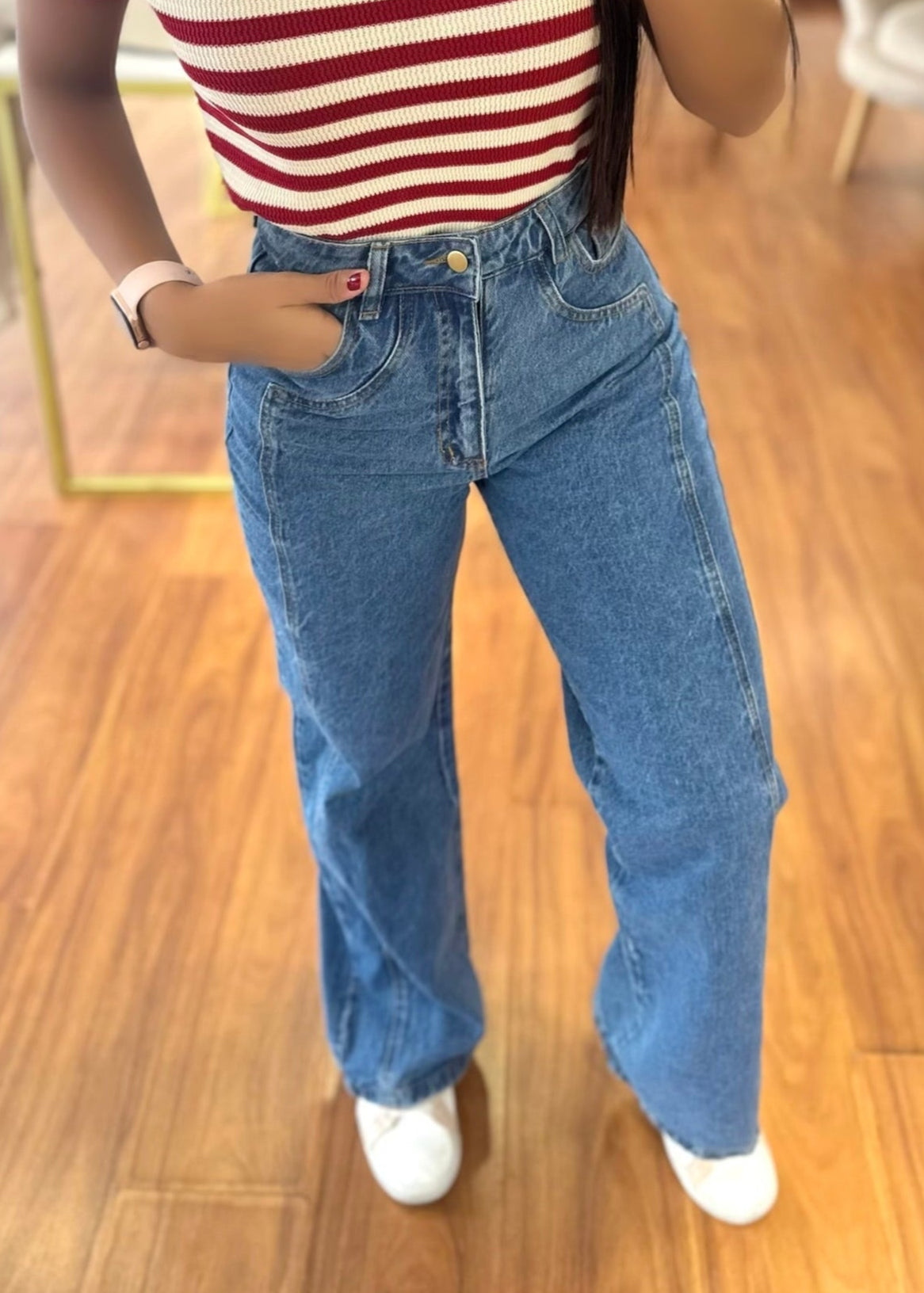 Jean wide leg tiro alto, ideal para realzar y estilizar tu figura. Confeccionado en denim rígido azul medio, con bolsillos clásicos delanteros y traseros.