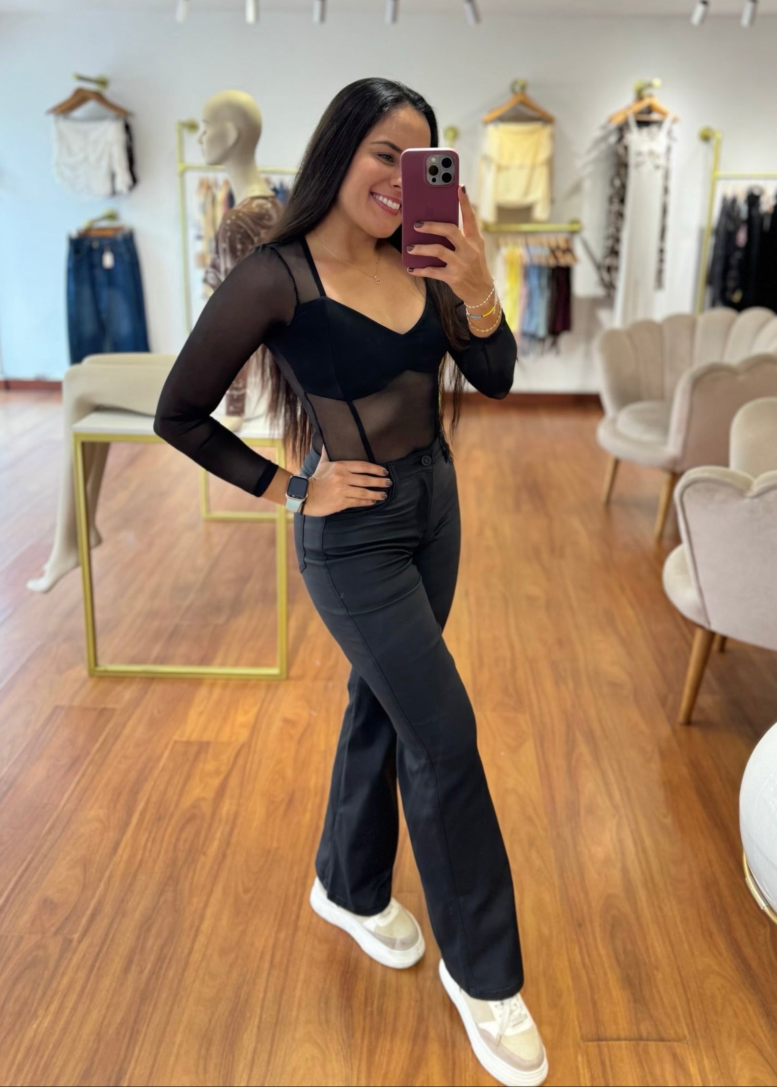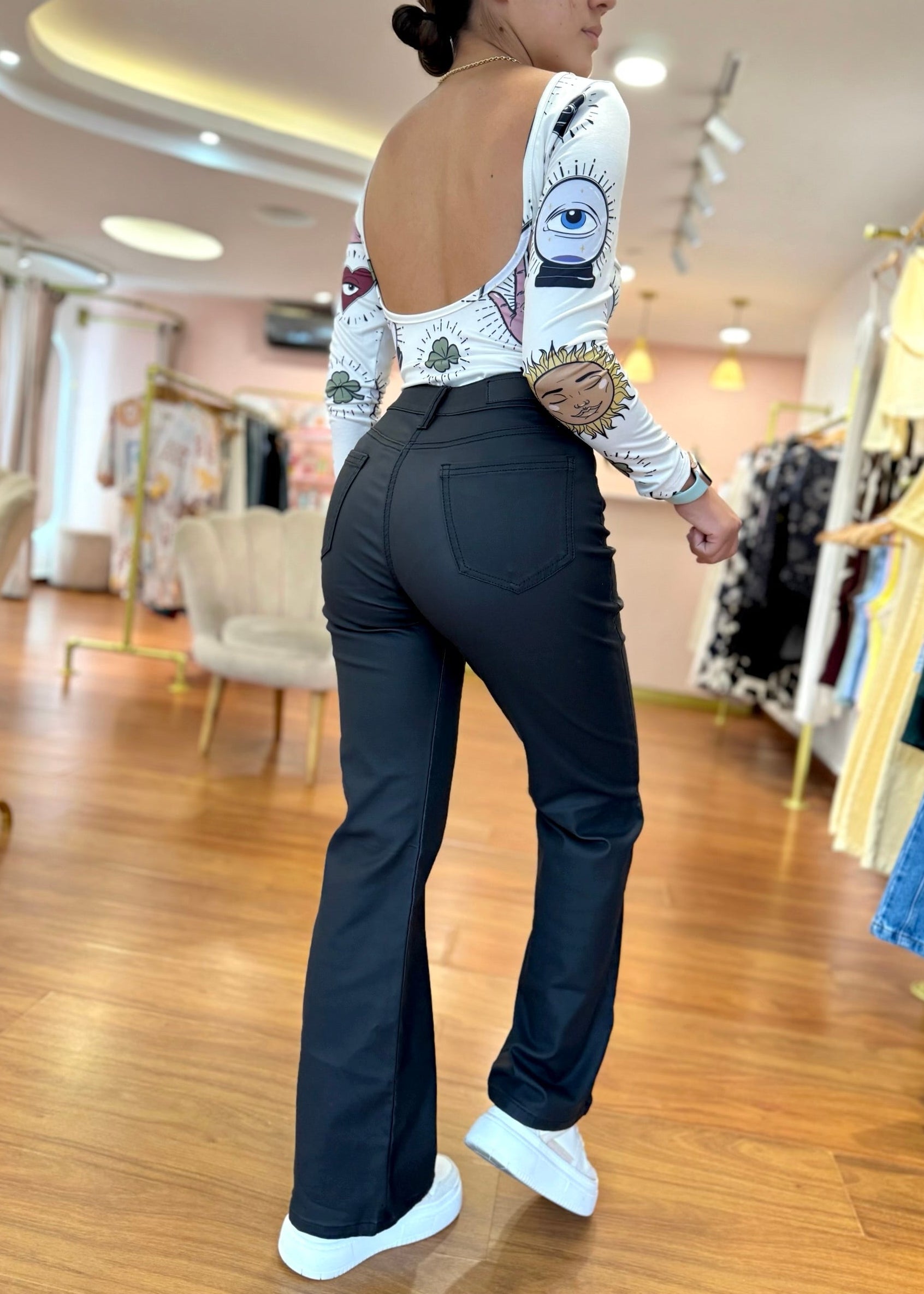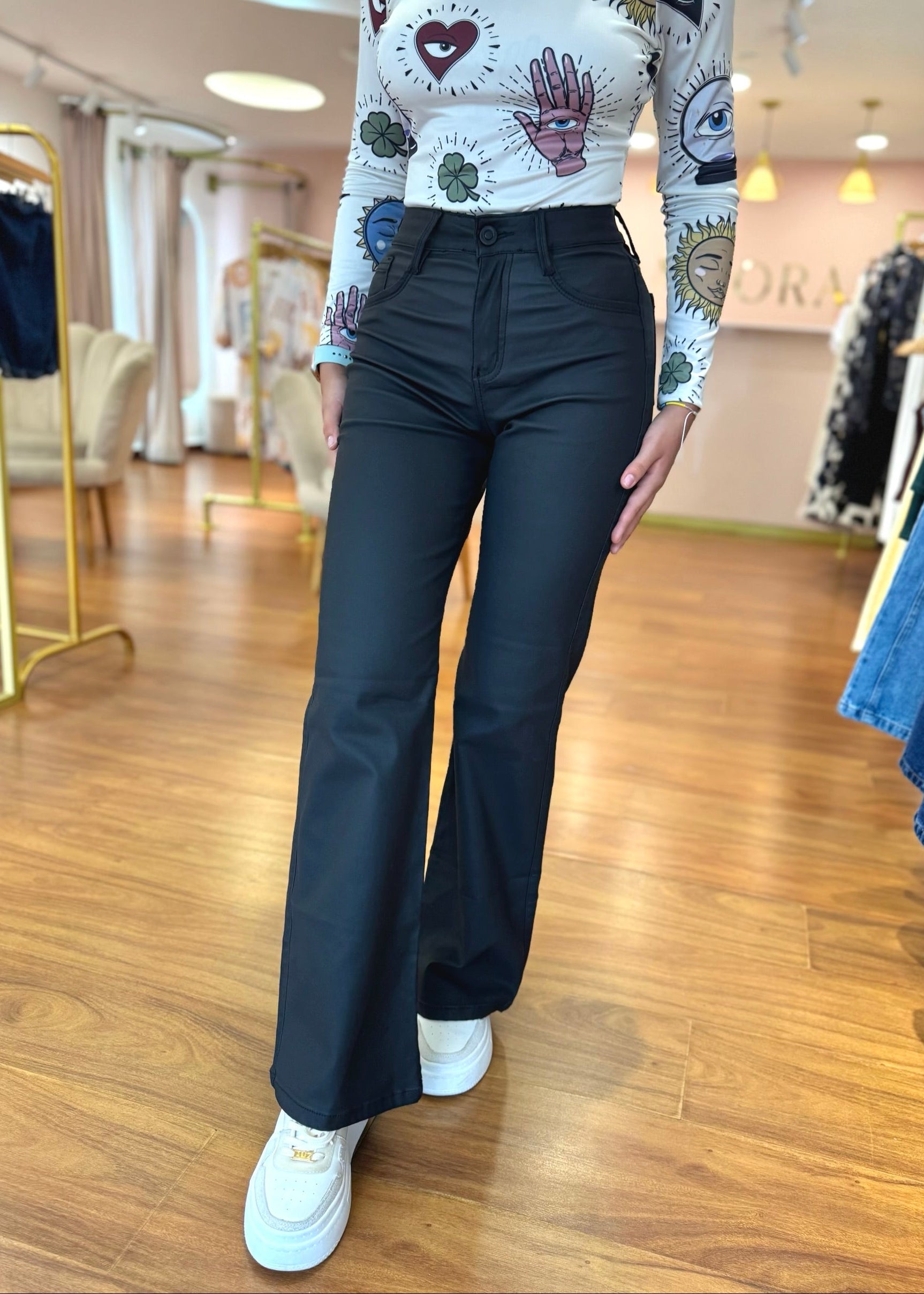Jean confeccionado en material efecto cuero, elastico, tiro alto y bota ancha.
