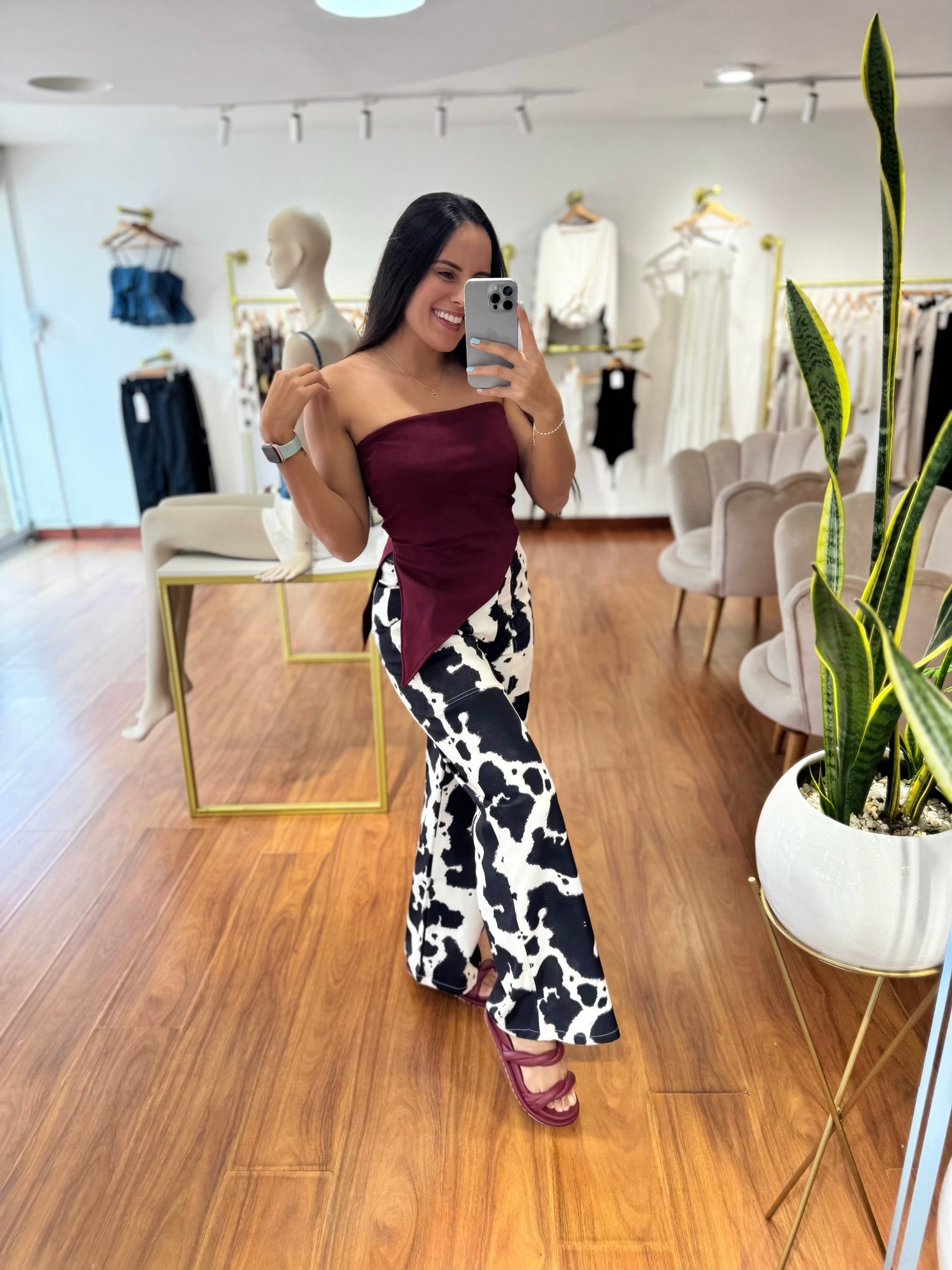 Pantalón en drill tendencia COW PRINT fondo blanco con manchas negras, tiro alto, bolsillos laterales y traseros con un corte clasico. La modelo en la foto usa talla S.