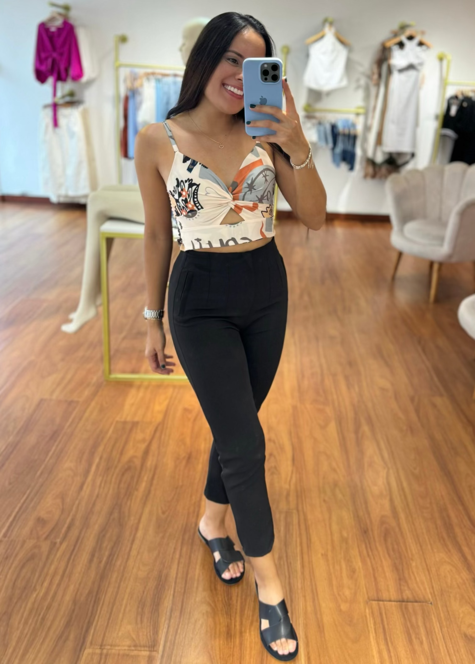 Pantalón negro en tela noche de viena, tiro alto con pinzas que ayudana moldear la figura. No tiene bolsillos.