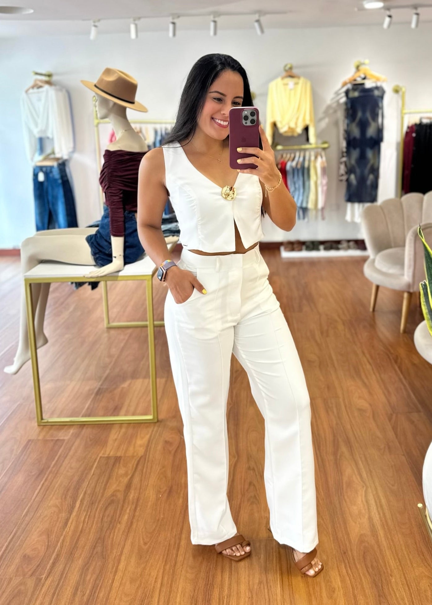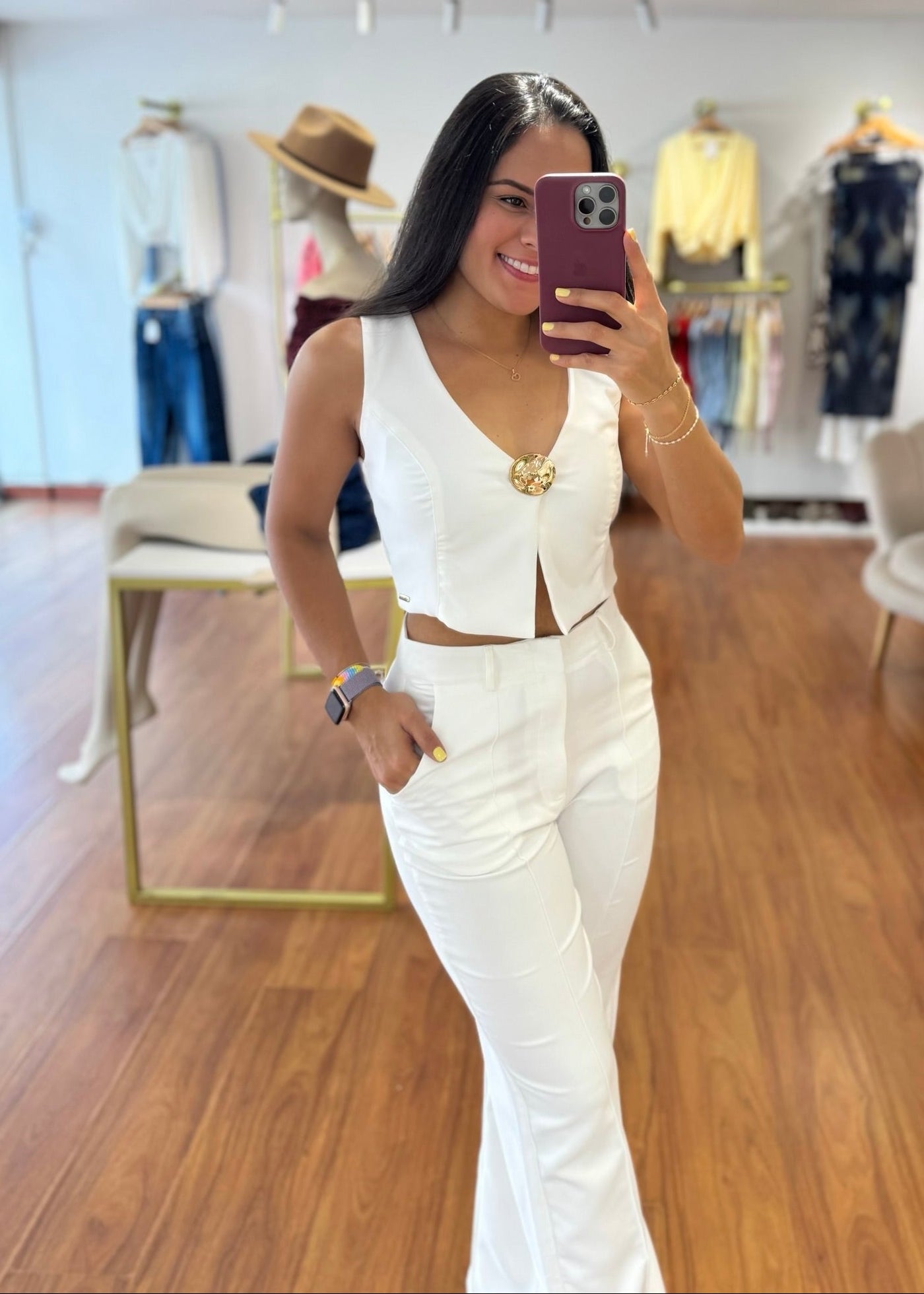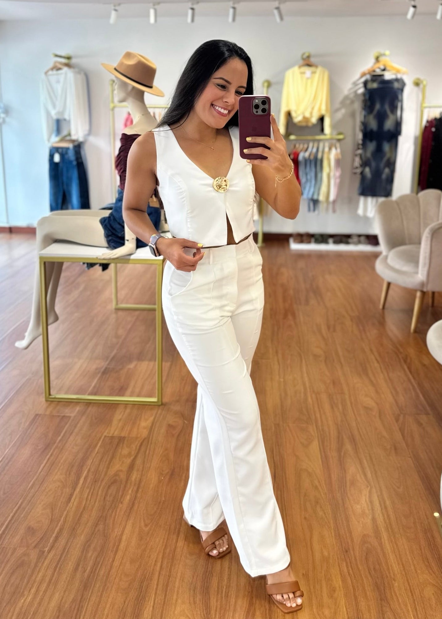 Set de chaleco y pantalon en color blanco, confeccionado en tela noche de viena. Su chaleco tiene un prnededor dorado en el frente el cual es ajustable. Pantalon con corte recto clasico, tiro algo y con bolsillos laterales.