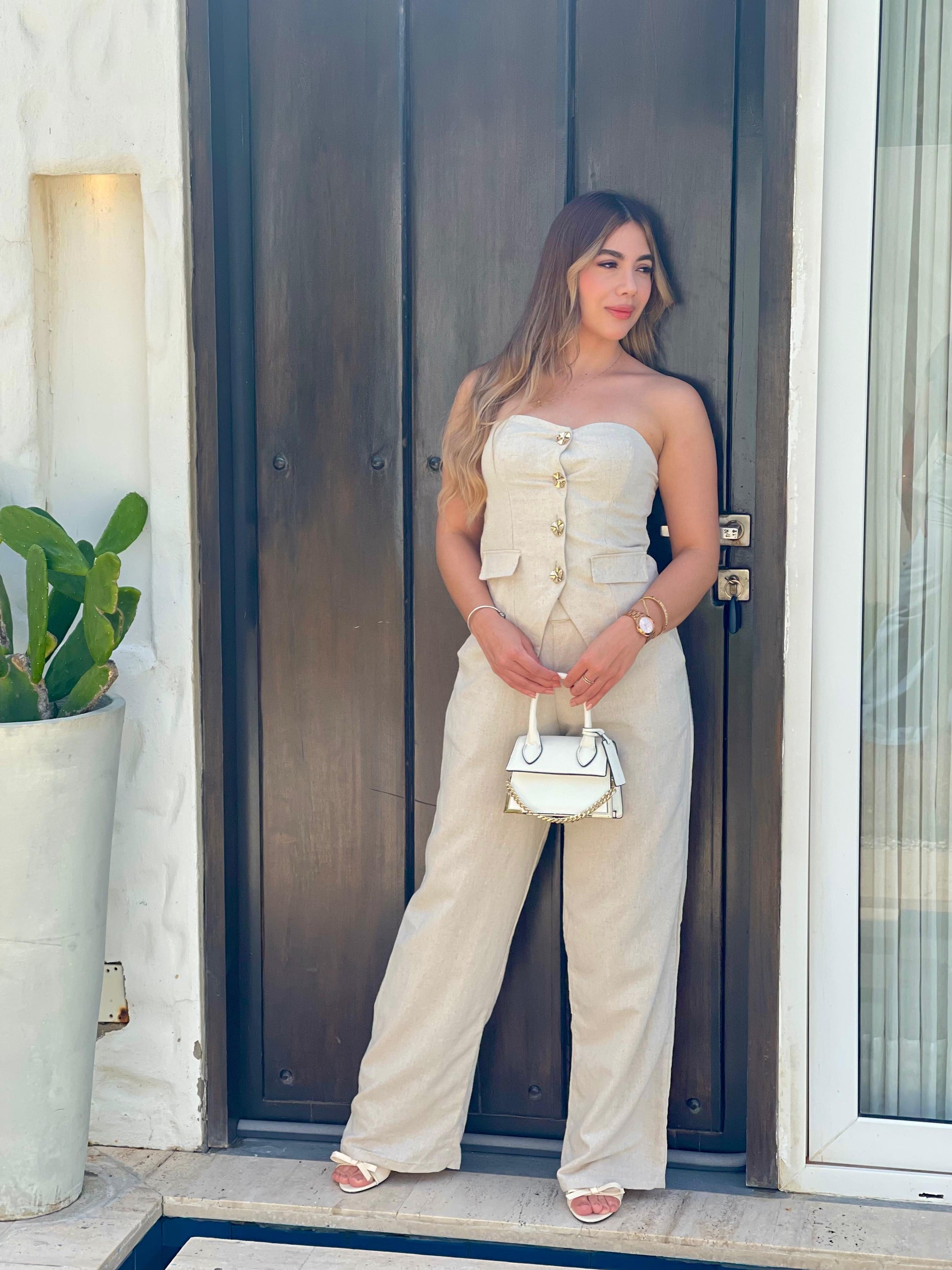 Set de blusa strapless y pantalón confeccionado en lino color beige. Pantalones con corte clásico, recto y con pretina encauchada en la parte trasera.