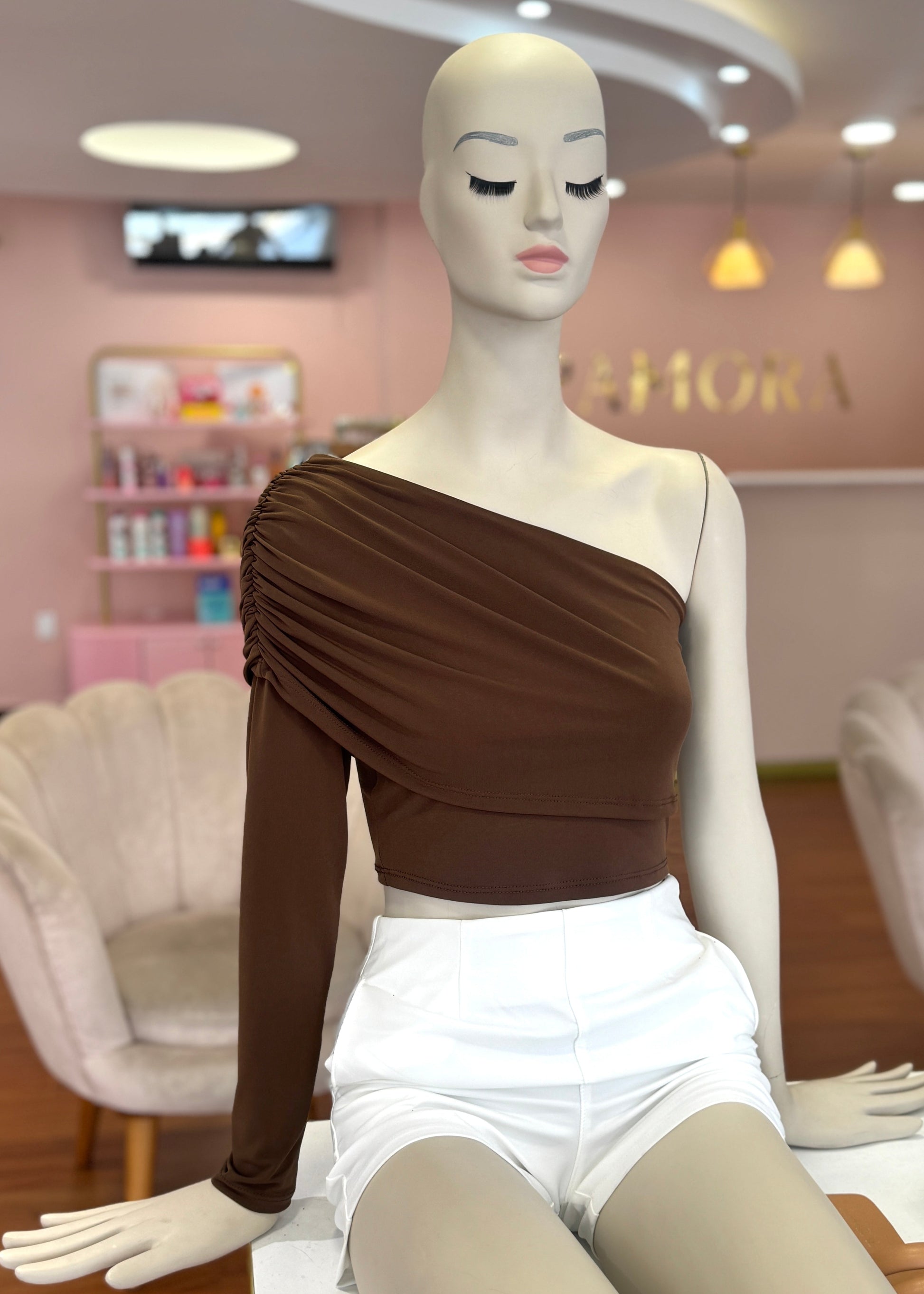 Top asimétrico manga larga medio beso café, con diseño fruncido en un hombro y caido estilo off-shoulder y detalle drapeado que aporta un toque elegante y moderno.
