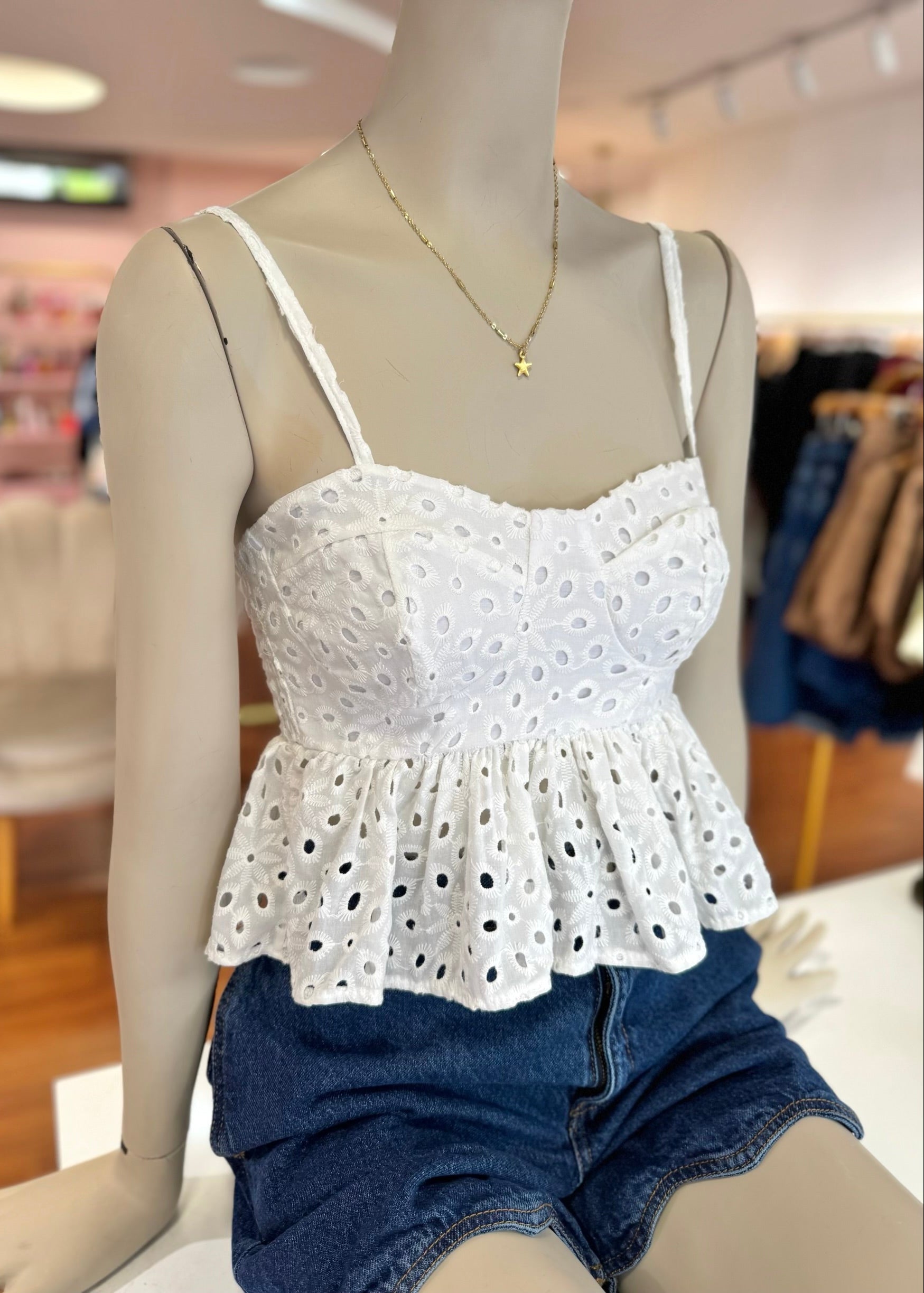 Blusa con corte tipo princesa, confeccionada en tela Ojalillo. Su espalda es encauchada y sus tiras con graduables.