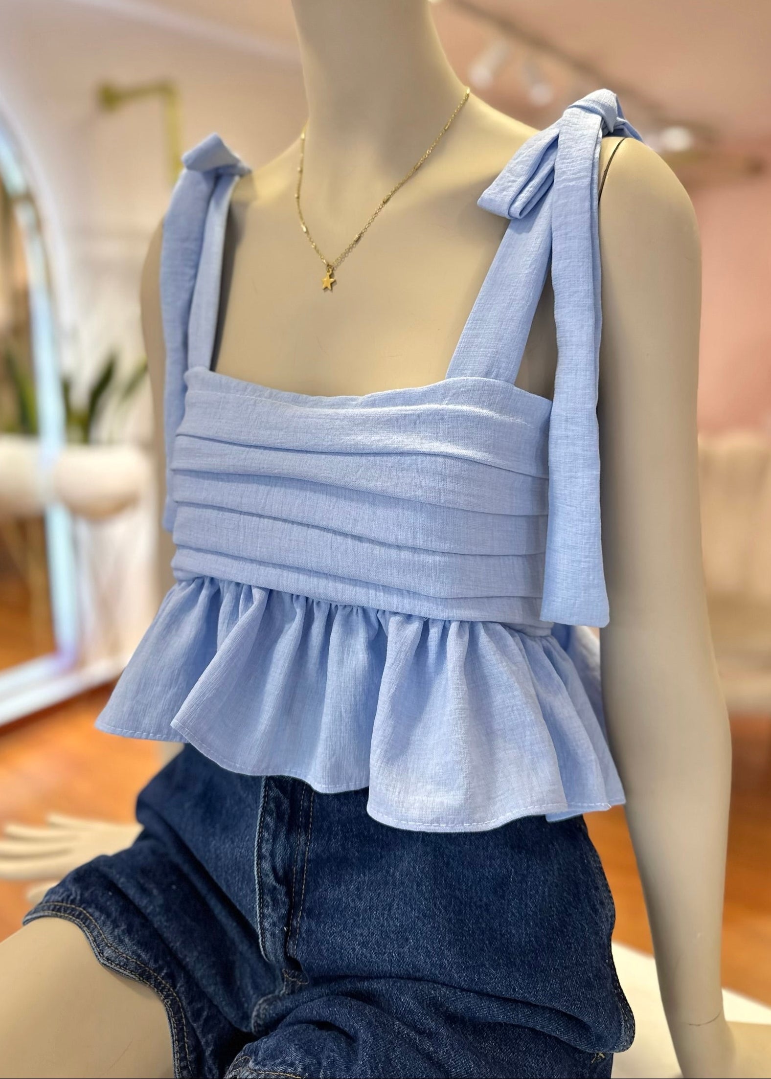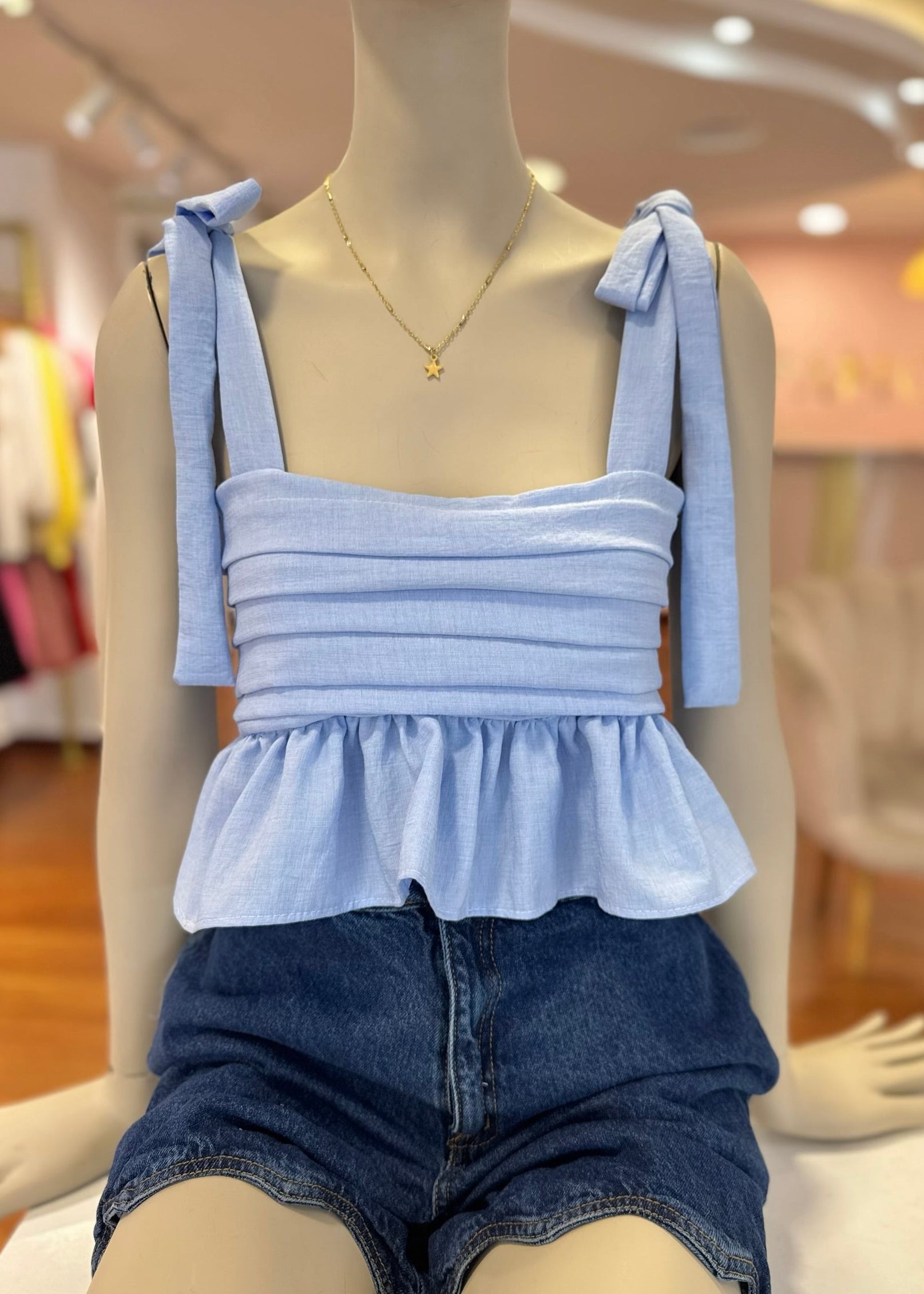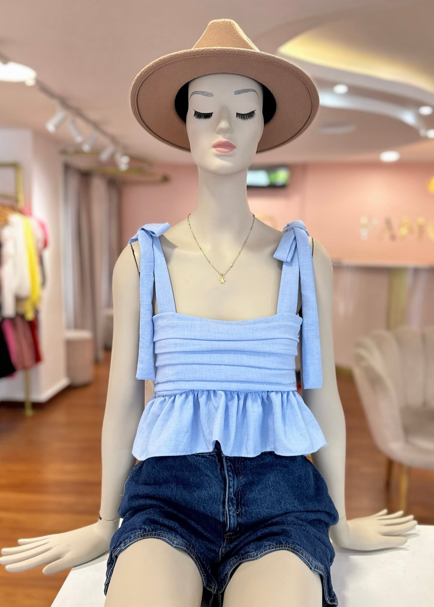 Top en tela seda hindú con detalle plisado en el frente, gola inferior y amarre con lazos en los hombros. Es talla única y su espalda es encauchada.